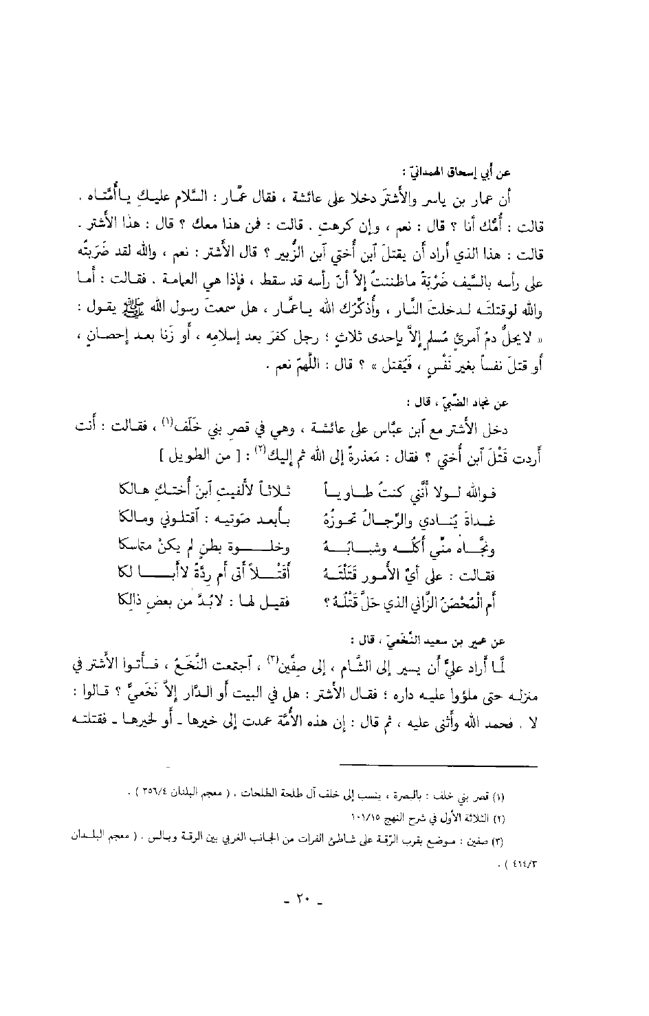 عن نجاد الضبي، قال: دخل الأشتر مع ابن عباس على عائشة، وهي في قصر بني خلف، فقالت: أنت أردت قتل ابن أختي؟ فقال: معذرة إلى الله ثم إليك: " من الطويل "