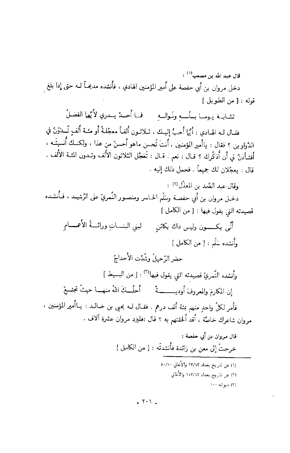 قال عبد الله بن مصعب: دخل مروان بن أبي حفصة على أمير المؤمنين الهادي، فأنشده مديهاً له حتى إذا بلغ قوله: " من الطويل "