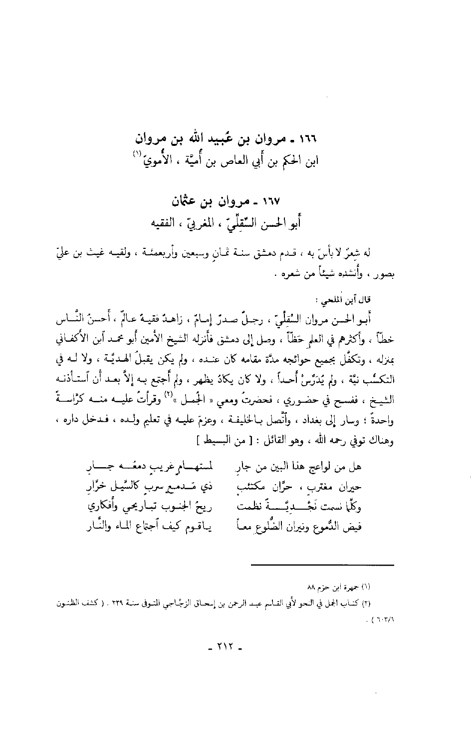 قال ابن الملحي: أبو الحسن مروان السقلي، رجل صدر إمام، زاهد فقيه عالم، أحسن الناس خطاً، وأكثرهم في العلم حظاً، وصل إلى دمشق فأنزله الشيخ الأمين أبو محمد ابن الأكفاني بمنزله، وتكفل بجميع حوائجه مدة مقامه عنده، ولم يكن يقبل الهدية، ولا له في التكسب نية، ولم يدرس أحداً، ولا كان يكاد يظهر، ولم أجتمع به إلا بعد أن استأذنته الشيخ، ففسح في حضوري، فحضرت ومعي " الجمل " وقرأن عليه منه كراسة واحدة؛ وسار إلى بغداد، واتصل بالخليفة، وغزم عليه في تعليم ولده، فدخل داره، وهناك توفي رحمه الله، وهو القائل: " من البسيط "