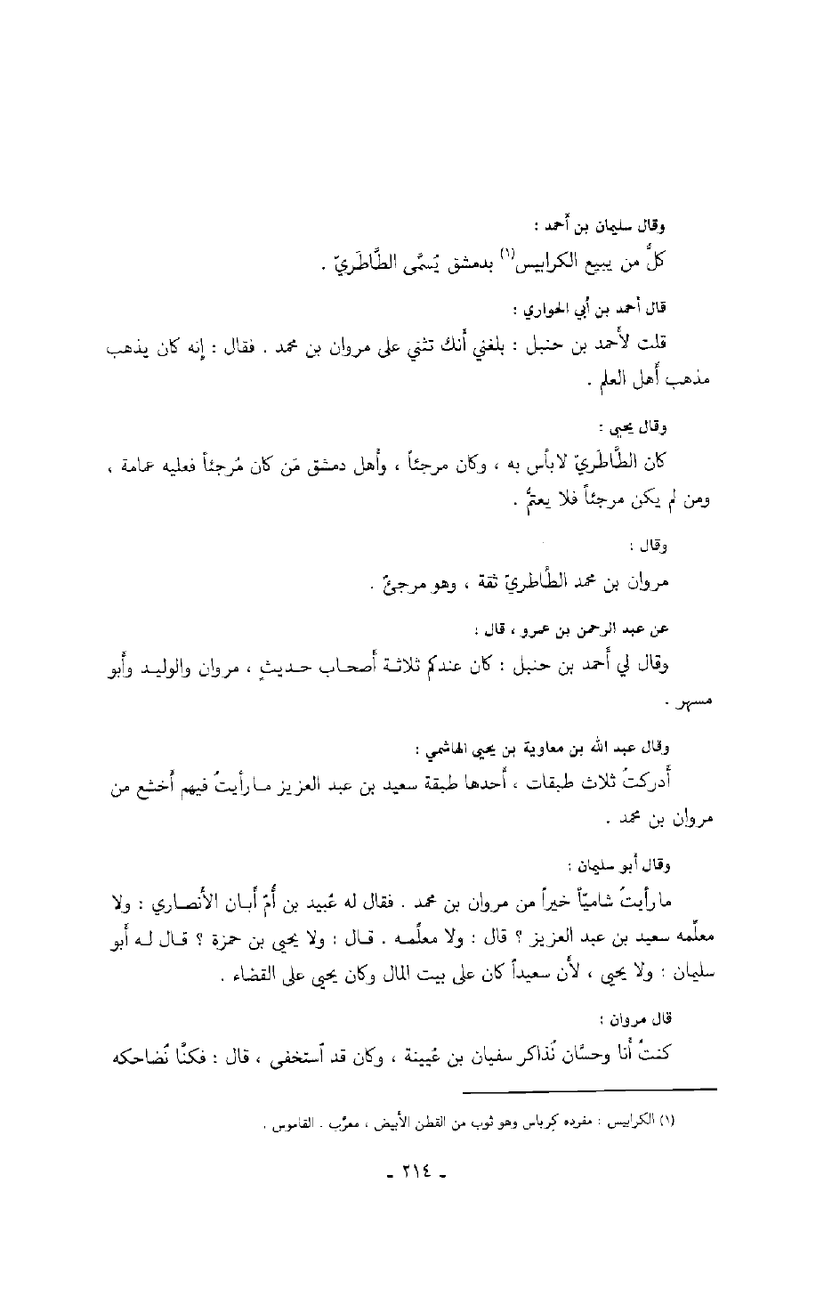 وقال: مروان بن محمد الطاطري ثقة، وهو مرجئ، عن عبد الرحمن بن عمرو، قال: وقال لي أحمد بن حنبل: كان عندكم ثلاثة أصحاب حديث، مروان والوليد وأبو مسهر.