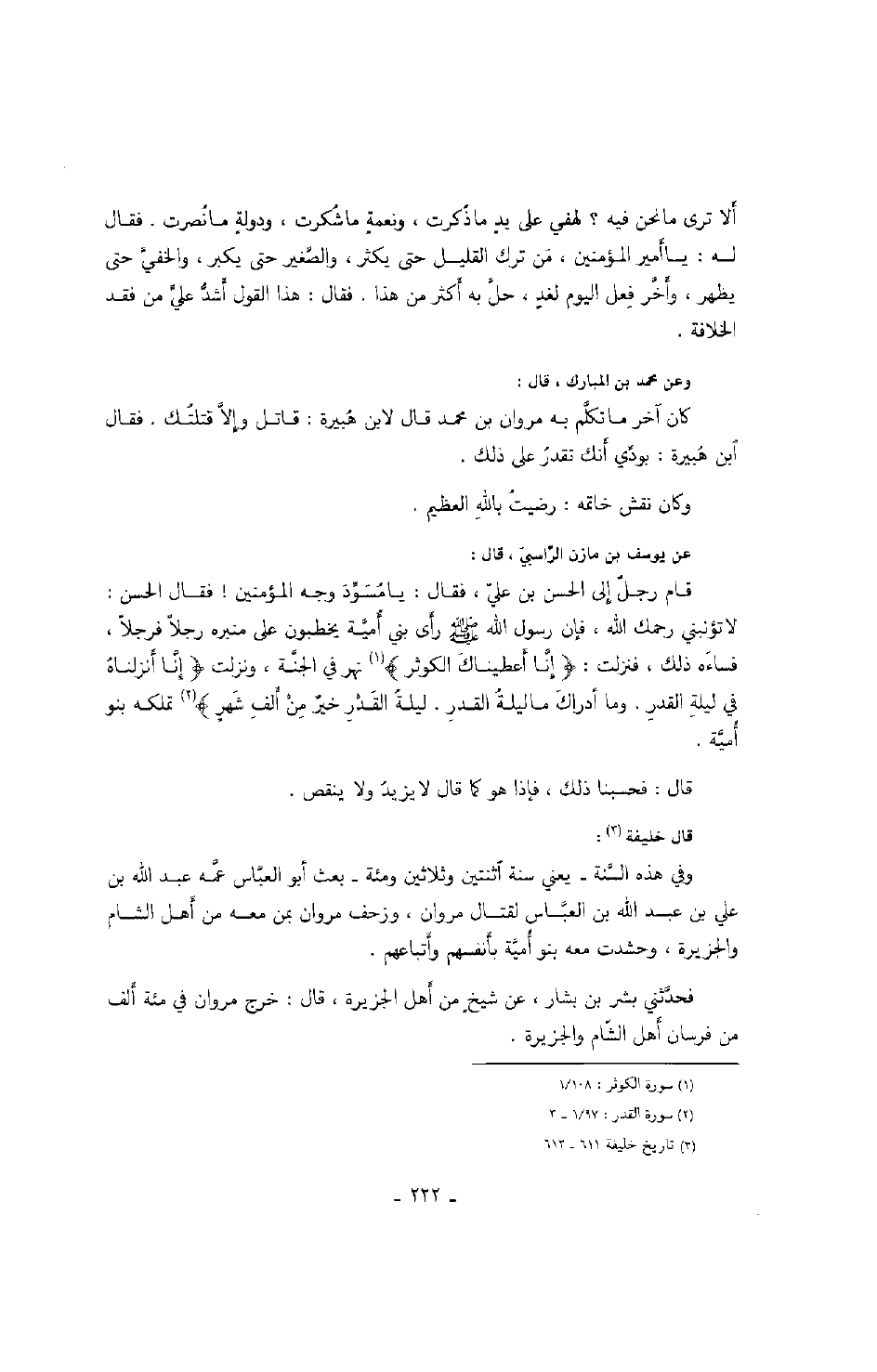 عن يوسف بن مازن الراسبي، قال: قام رجل إلى الحسن بن علي، فقال: يا مسود وجه المؤمنين! فقال الحسن: لا تؤنبني رحمك الله، فإن رسول الله صَلَّى اللهُ عَلَيْهِ وَسَلَّمَ رأى بني أمية يخطبون على منبره رجلاً فرجلاً، فساءه ذلك، فنزلت: " إنا أعطيناك الكوثر " نهر في الجنة، ونزلت " إنا أنزلناه في ليلة القدر. وما أدراك ما ليلة القدر. ليلة القدر خير من ألف شهر " تملكه بنو أمية.