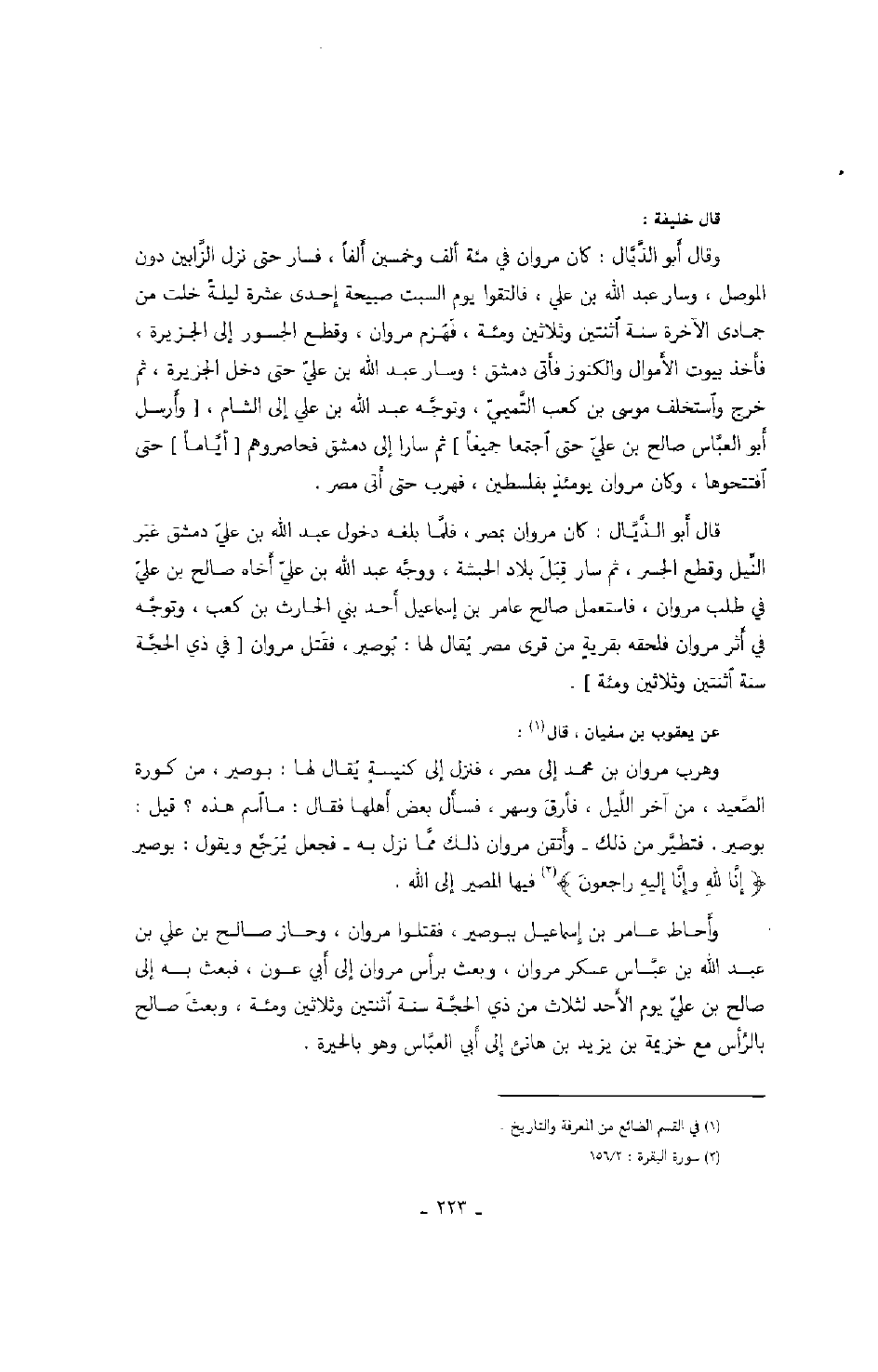 عن يعقوب بن سفيان، قال: وهرب مروان بن محمد إلى مصر، فنزل إلى كنيسة يقال لها: بوصير، من كورة الصعيد، من آخر الليل، فأرق وسهر، فسأل بعض أهلها فقال: ما اسم هذه؟ قيل: بوصير. فتطير من ذلك - وأتقن مروان ذلك مما نزل به - فجعل يرجع ويقول: بوصير " إنا لله وإنا إليه راجعون " فيها المصير إلى الله.
