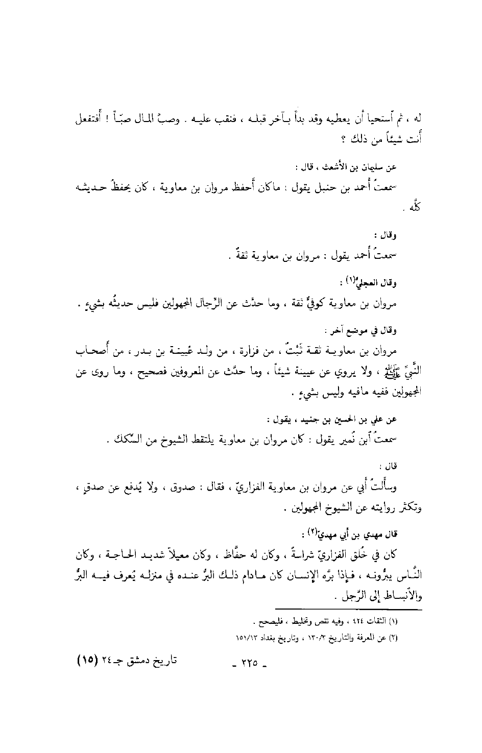 له، ثم استحيا أن يعطيه وقد بدأ يآخر قبله، فنقب عليه. وصب الماء صباً! أفتفعل أنت شيئاً من ذلك؟ عن سليمان بن الأشعث، قال: سمعت أحمد بن حنبل يقول: ما كان أحفظ مروان بن معاوية، كان يحفظ حديثه كله.