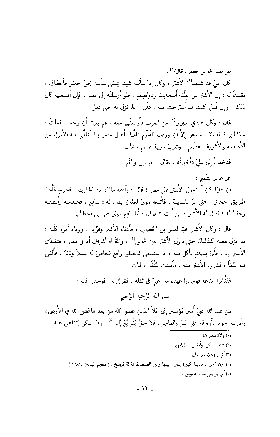 عن عبد الله بن جعفر، قال: كان علي قد شنف الأشتر، وكان إذا سألته شيئاً يمسني سألته بحق جعفر فأعطاني، فقلت له: إن الأشتر من علية أصحابك ودواهيهم، فلو أرسلته إلى مصر، فإن افتتحها كان ذلك، وإن قتل كنت قد استرحت منه؛ فأبى. فلم نزل به حتى فعل.