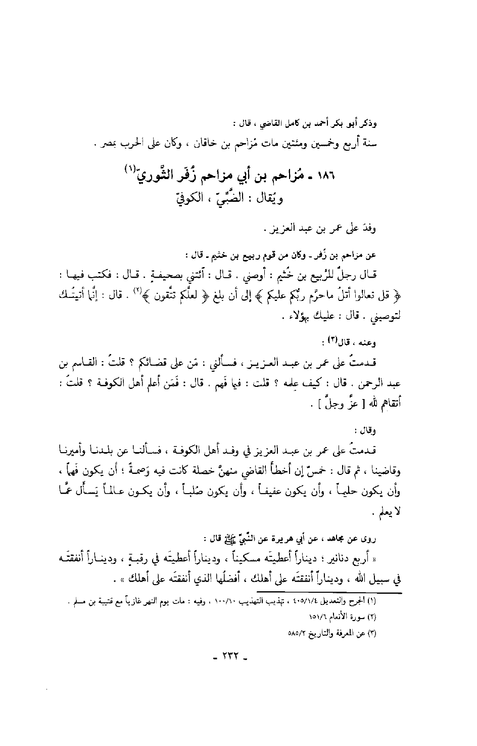 عن مزاحم بن زفر - وكان من قوم ربيع بن خثيم - قال: قال رجل للربيع بن خثيم: أوصني. قال: ائتني بصحيفة. قال: فكتب فيها: " قل تعالوا أتل ما حرم ربكم عليكم " إلى أن بلغ " لعلكم تتقون ". قال: إنما أتيتك لتوصيني. قال: عليك بهؤلاء.