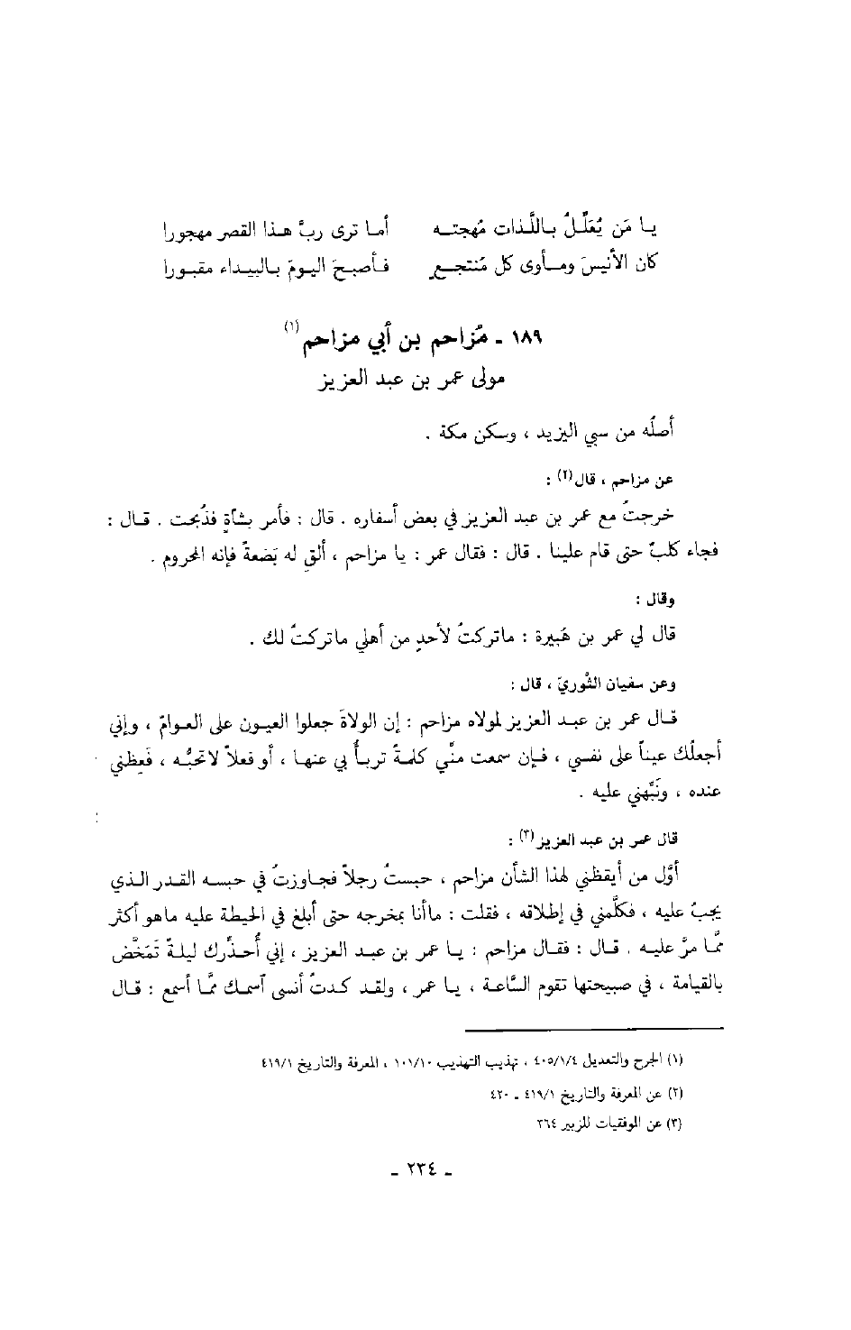 عن مزاحم، قال: خرجت مع عمر بن عبد العزيز في بعض أسفاره. قال: فأمر بشاة فذبحت. قال: فجاء كلب حتى قام علينا، قال: فقال عمر: مزاحميا، ألق له بضعة فإنه المحروم.