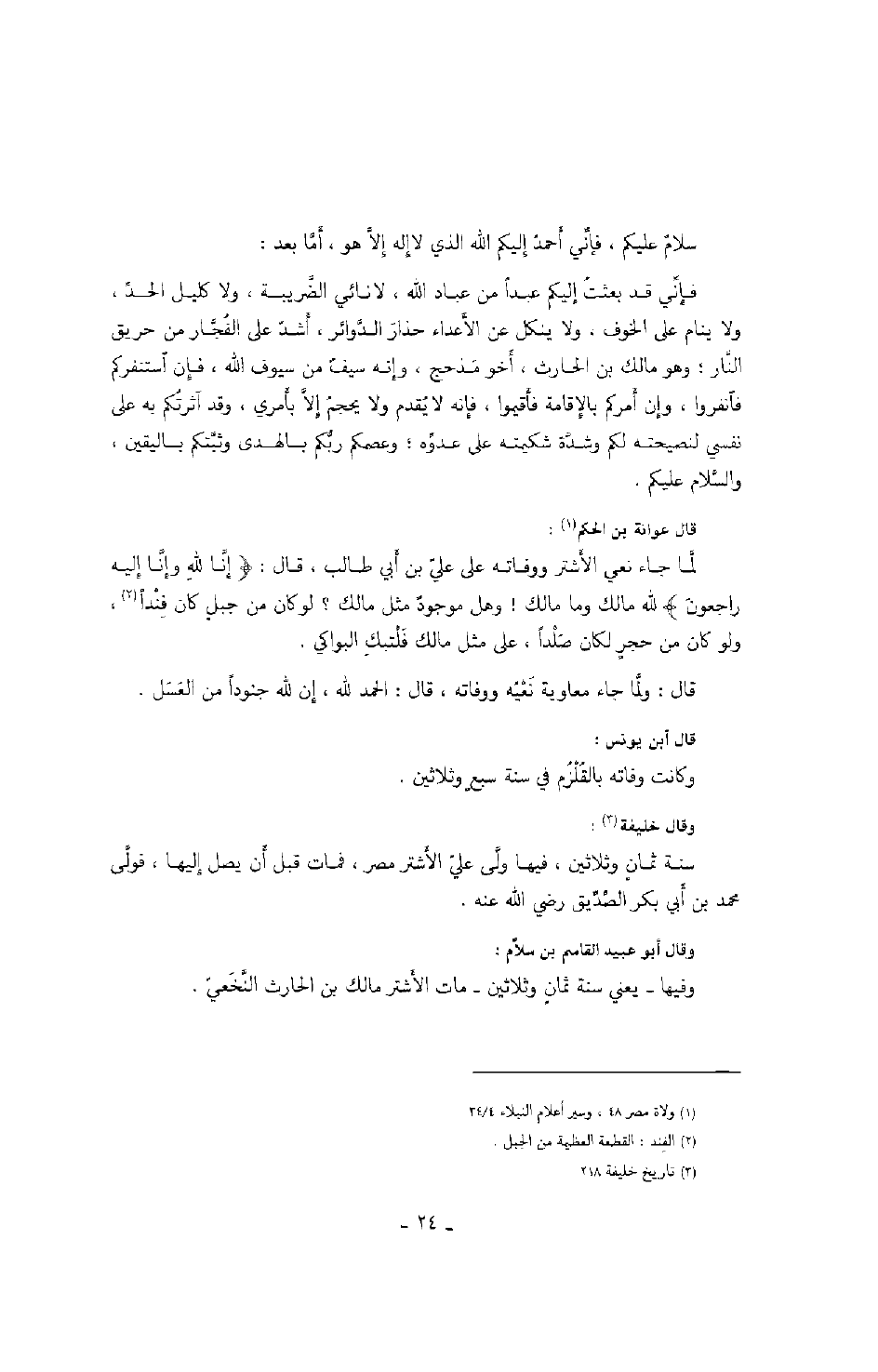 سلام عليكم، فإني قد بعثت إليكم عبداً من عباد الله، لا نائي الضريبة، ولا كليل الحد، ولا ينام على الخوف، ولا ينكل عن الأعداء حذار الدوائر، أشد على الفجار من حريق النار؛ وهو مالك بن الحارث، أخو مذحج، وإنه سيف من سيوف الله، فإن استنفركم فانفروا، وإن أمركم بالإقامة فأقيموا، فإنه لا يقدم ولا يحجم إلا بأمري، وقد آثرتكم به على نفسي لنصيحته لكم وشدة شكيمته على عدوه؛ وعصمكم ربكم بالهدى وثبتكم باليقين، والسلام عليكم.