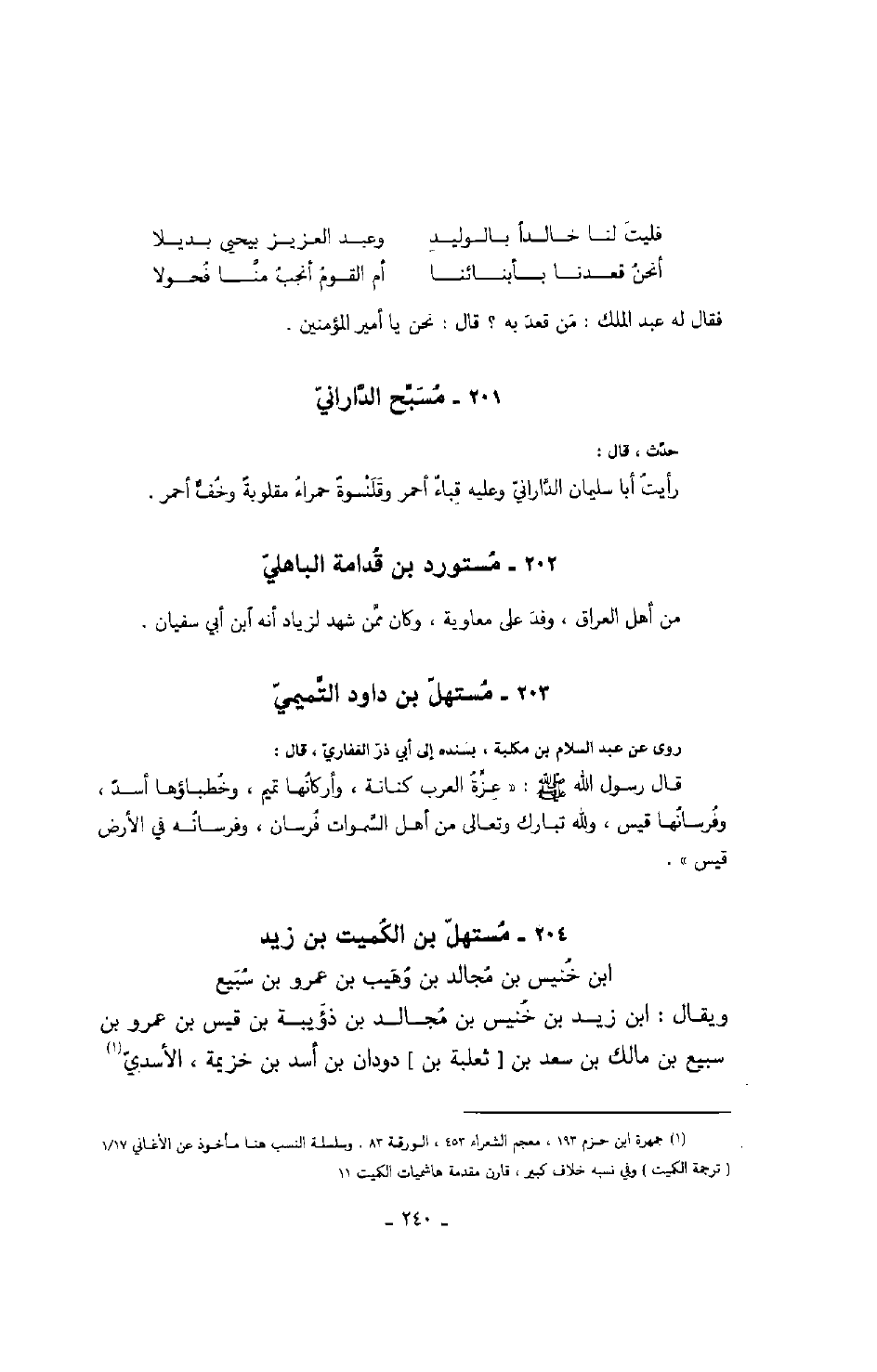 روى عن عبد السلام بن مكلبة، بسنده إلى أبي ذر الغفاري، قال: قال رسول الله صَلَّى اللهُ عَلَيْهِ وَسَلَّمَ: " عزة العرب كنانة، وأركانها تميم، وخباؤها أسد، وفرسانها قيس، ولله تبارك وتعالى من أهل السموات فرسان، وفرسانه في الأرض قيس ".
