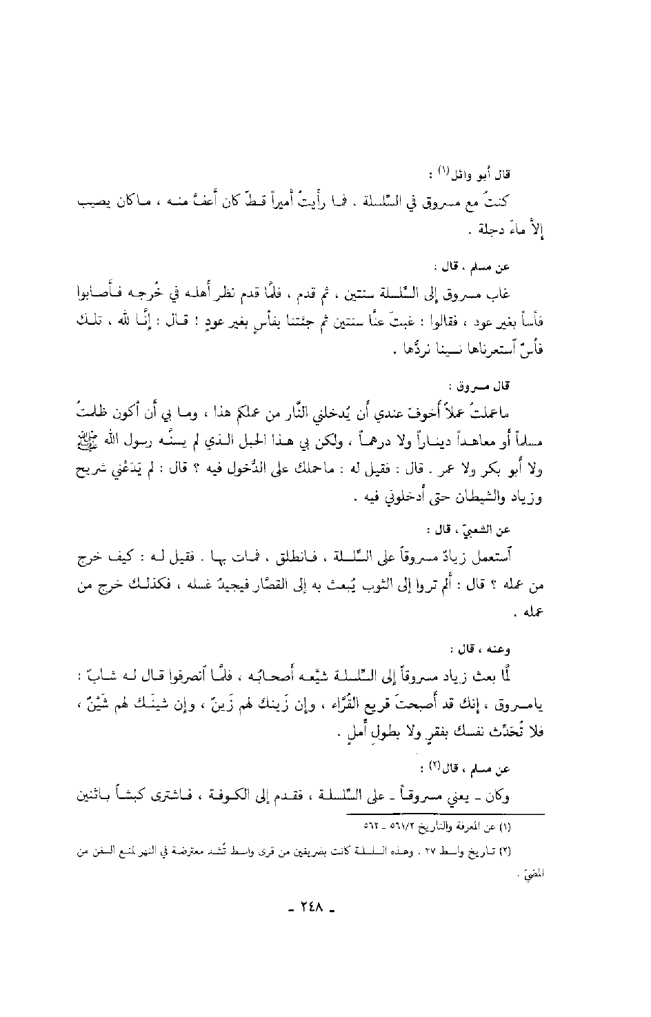 عن مسلم، قال: وكان - يعني مسروقاً - على السلسلة، فقدم إلى الكوفة، فاشترى كبشاً باثنين