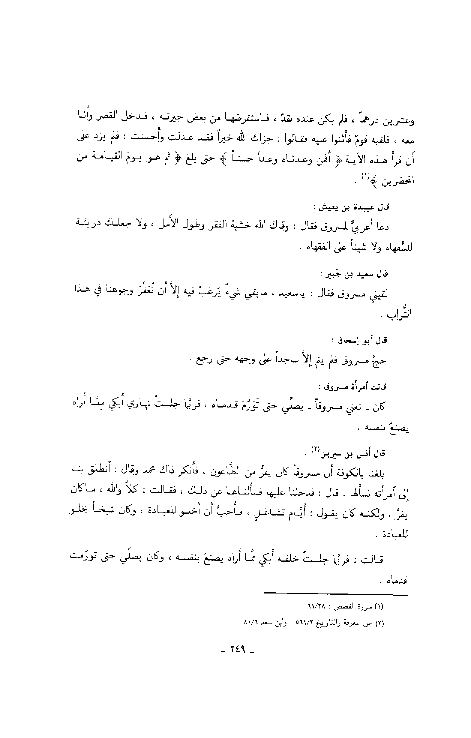 قالت امرأة مسروق: كان - تعني مسروقاً - يصلي حتى تورم قدماه، فربما جلست نهاري أبكي مما أراه يصنع بنفسه.