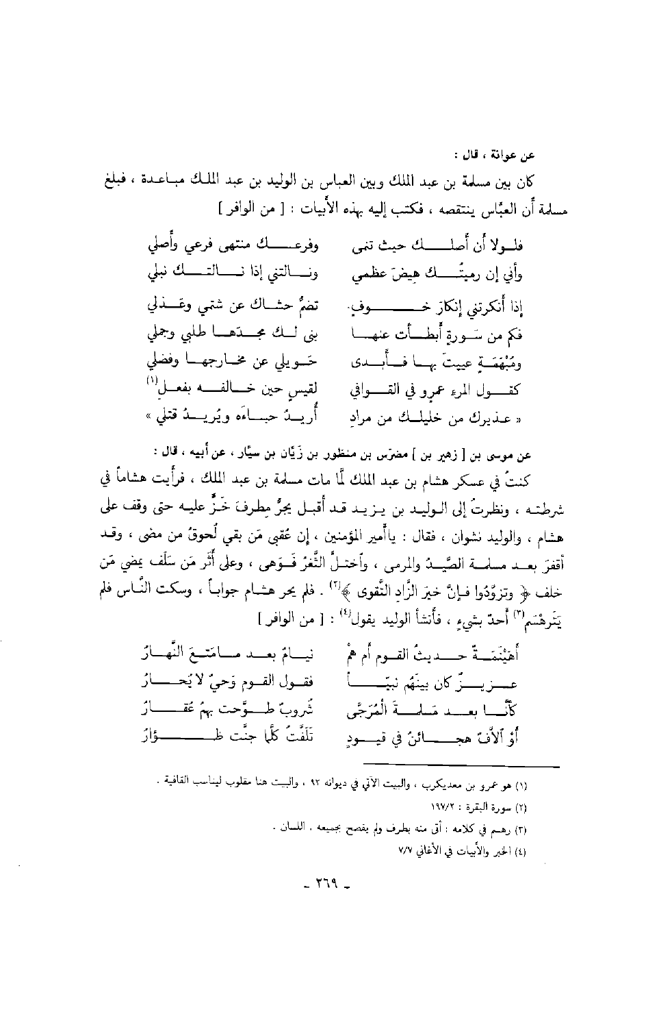 عن عوانة، قال: كان بين مسلمة بن عبد الملك وبين العباس بن الوليد بن عبد الملك مباعدة، فبلغ مسلمة أن العباس ينتقصه، فكتب إليه بهذه الأبيات: " من الوافر "