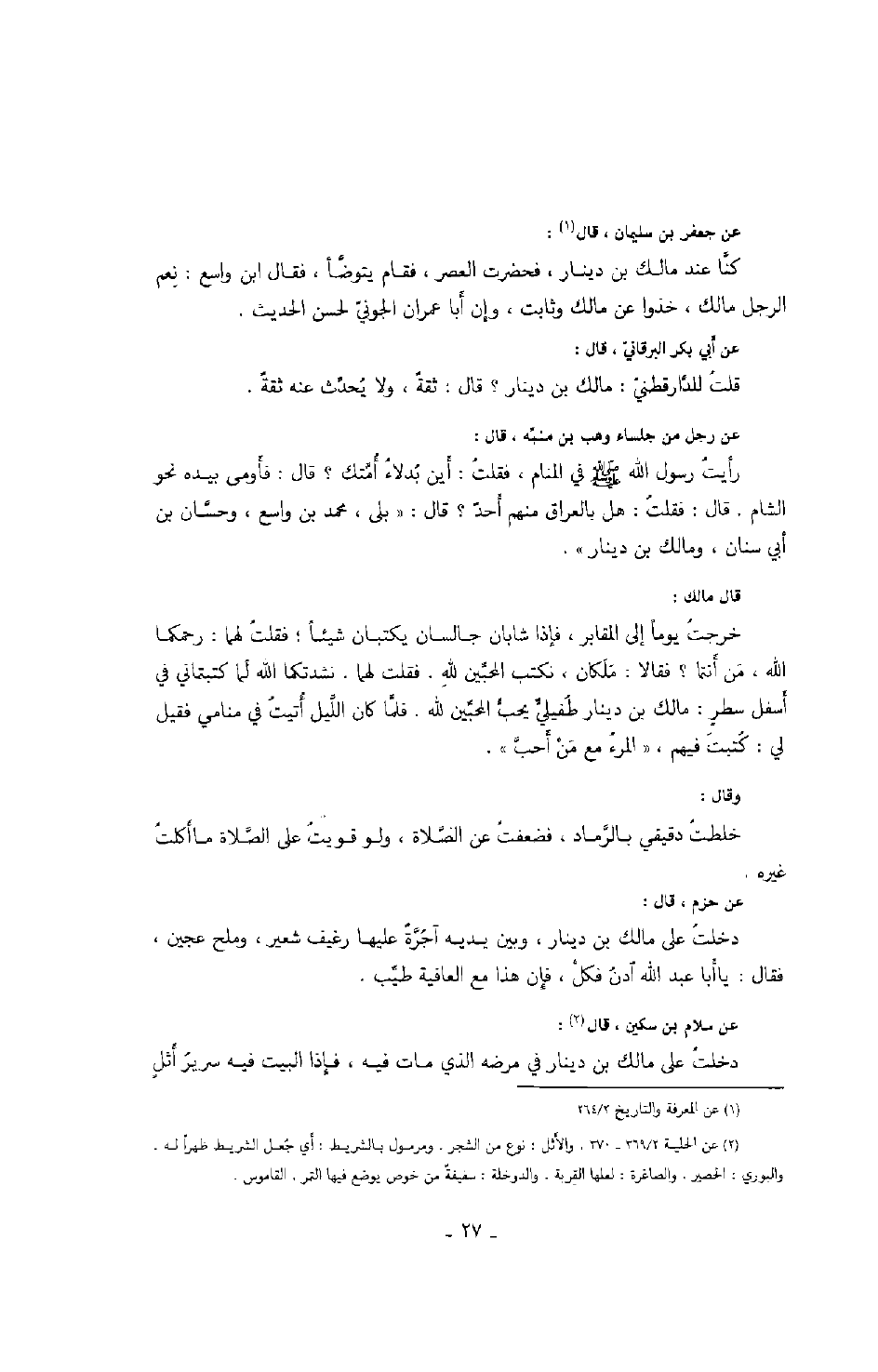 عن جعفر بن سليمان، قال: كنا عند مالك بن دينار، فحضرت العصر، فقام يتوضأ، فقال ابن واسع: نعم الرجل مالك، خذوا عن مالك وثابت، وإن أبا عمران الجوني لحسن الحديث.