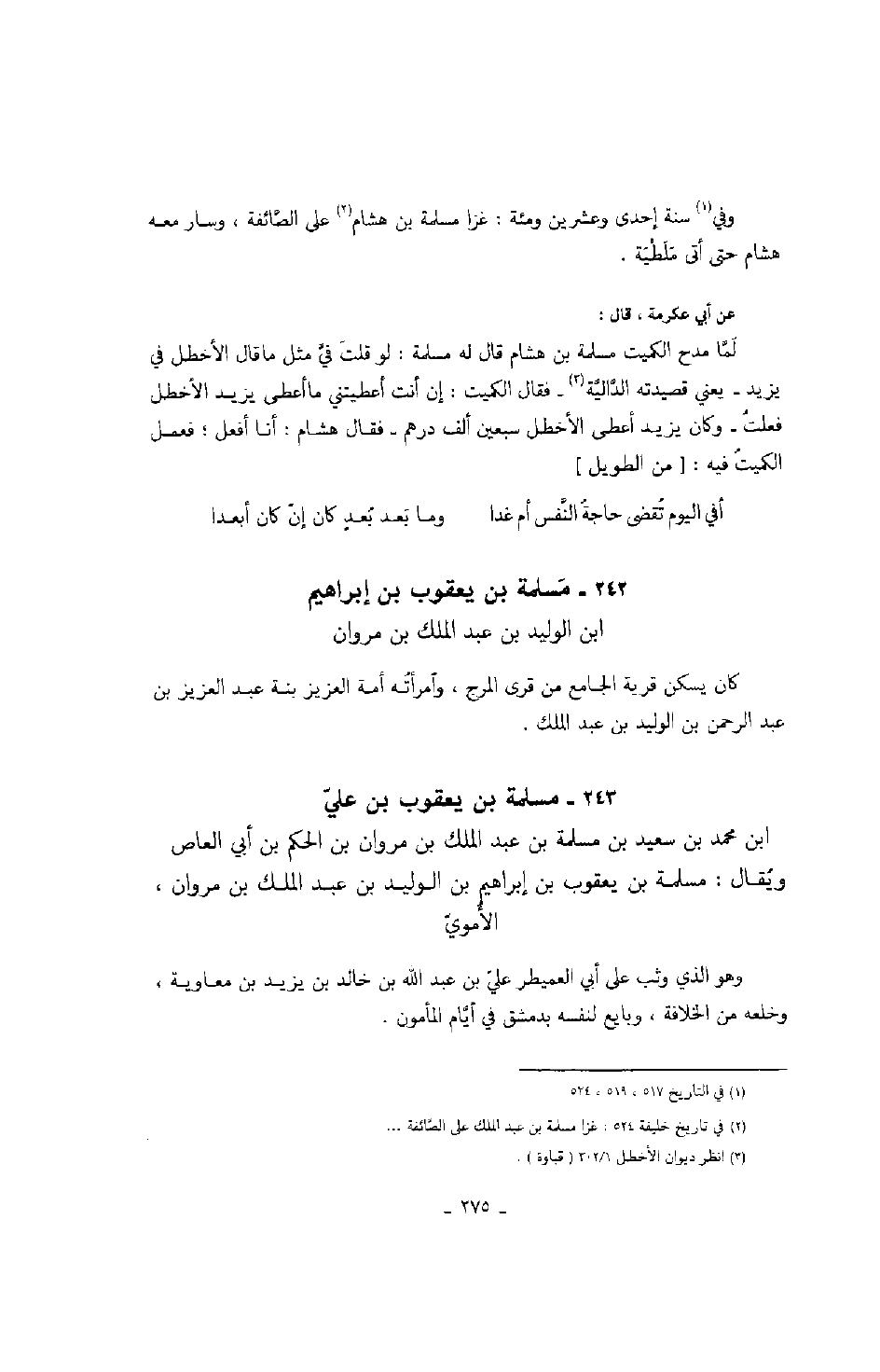 عن أبي عكرمة، قال: لما مدح الكميت مسلمة بن هشام قال له مسلمة: لو قلت في مثل ما قال الأخطل في يزيد - يعني قصيدته الدالية - فقال الكميت: إن كنت أعطيتني ما أعطى زيد الأخطل فعلت - وكان يزيد أعطى الأخطل سبعين ألف درهم - فقال هشام: أنا أفعل؛ فعمل الكميت فيه: " من الطويل "