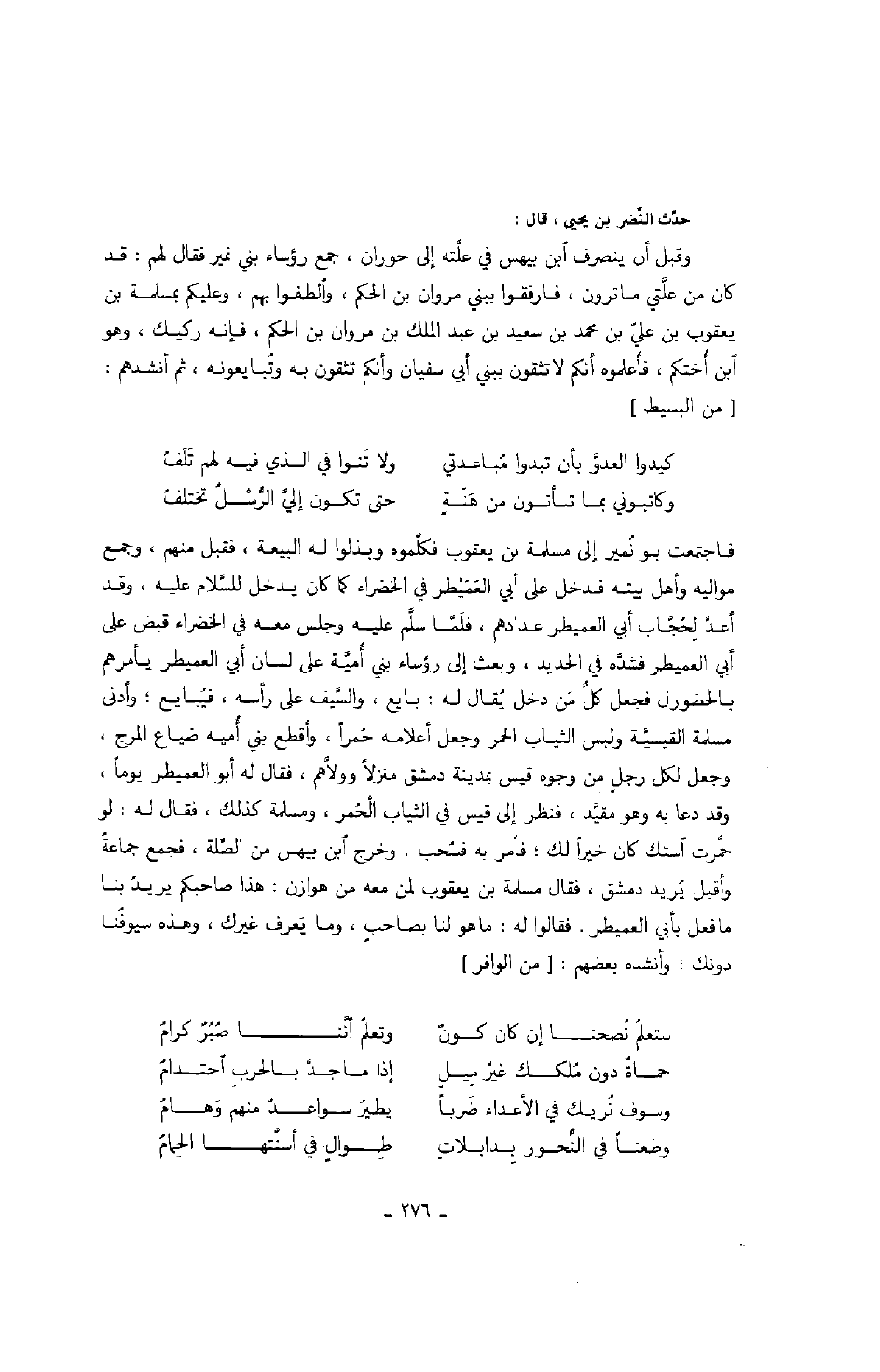 حدث النضر بن حيى، قال: وقبل أن ينصرف ابن بيهس في علته إلى حوران، جمع رؤساء بني نمير فقال لهم: قد كان من علتي ما ترون، فارفقوا ببني مروان بن الحكم، وألطفوا بهم، وعليكم بمسلمة بن يعقوب بن علي بن محمد بن سعيد بن عبد الملك بن مروان بن الحكم، فإنه ركيك، وهو ابن أختكم، فأعلموه أنكم لا تثقون به وتبايعونه، ثم أنشدهم: " من البسيط "