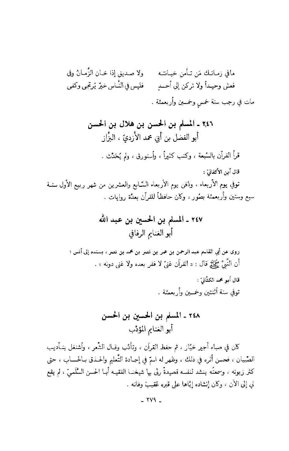 أبو الغنايم الرفافي روى عن أبي القاسم عبد الرحمن بن عمر بن نصر، بسنده إلى أنس؛ أن النبي صَلَّى اللهُ عَلَيْهِ وَسَلَّمَ قال: " القرآن غنى لا فقر بعده ولا غنى دونه ".