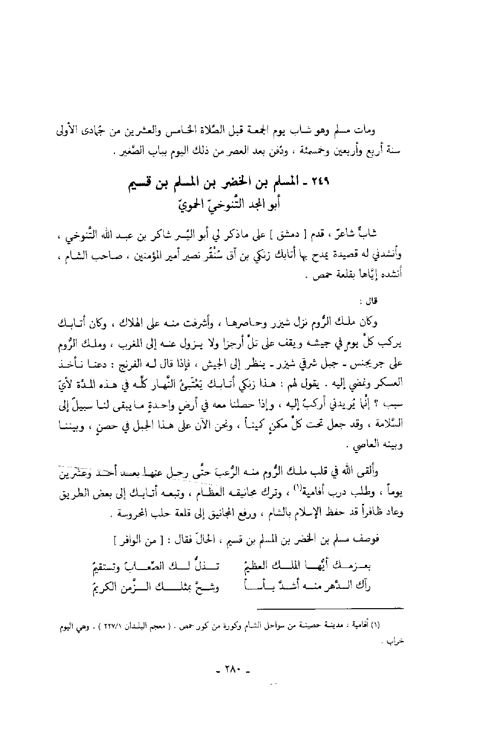 فوصف مسلم بن الخضر بن المسلم بن قسيم، الحال فقال: " من الوافر "