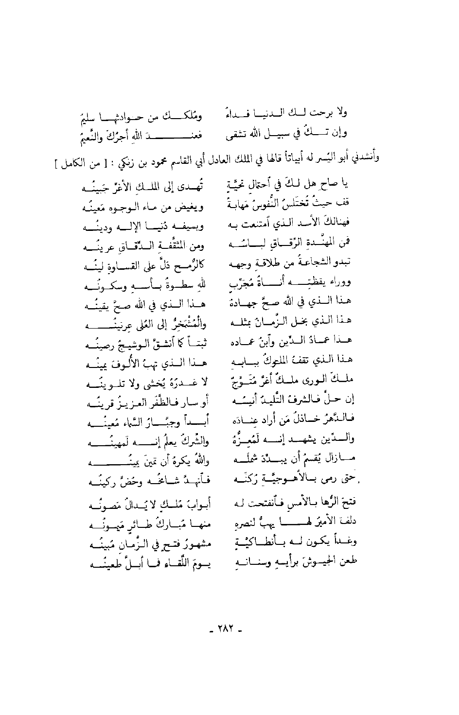 وأنشدني أبو اليسر له أبياتاً قالها في الملك العادل أبي القاسم محمود بن زنكي: " من الكامل "