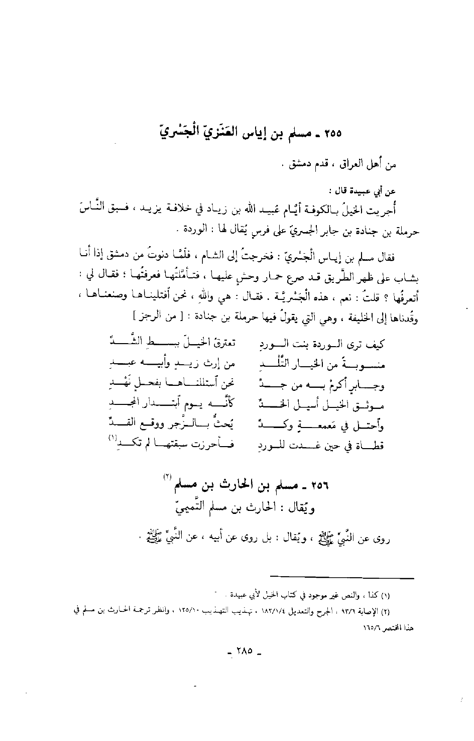 فقال مسلم بن إاس الجسري: فخرجت إلى الشام، فلما دنوت من دمشق إذا أنا بشاب على ظهر الطريق قد صرع حمار وحش عليها، فتأملتها فعرفتها؛ فقال لي: أتعرفها؟ قلت: نعم، هذه الجسرية. فقال: هي والله، نحن افتليناها وصنعناها، وقدناها إلى الخليفة، وهي التي يقول فيها حرملة بن جنادة: " من الرجز "