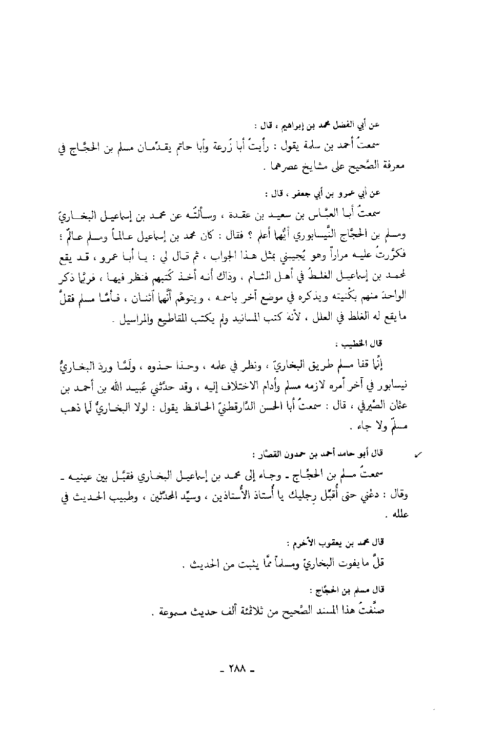 عن الفضل محمد بن إبراهيم، قال: سمعت أحمد بن سلمة يقول: رأيت أبا زرعة وأبا حاتم يقدمان مسلم بن الحجاج في معرفة الصحيح على مشايخ عصرهما.