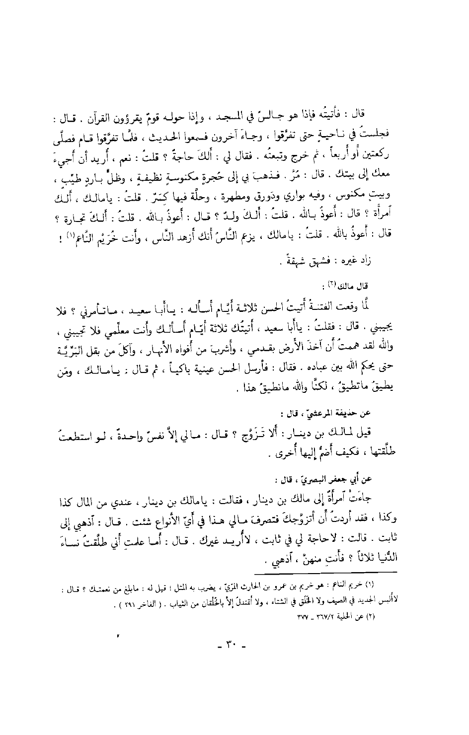 عن حذيفة المرعشي، قال: قيل لمالك بن دينار: ألا تتزوج؟ قال: ما لي إلا نفس واحدة، لو استطعت طلقتها، فكيف أضم إليها أخرى.