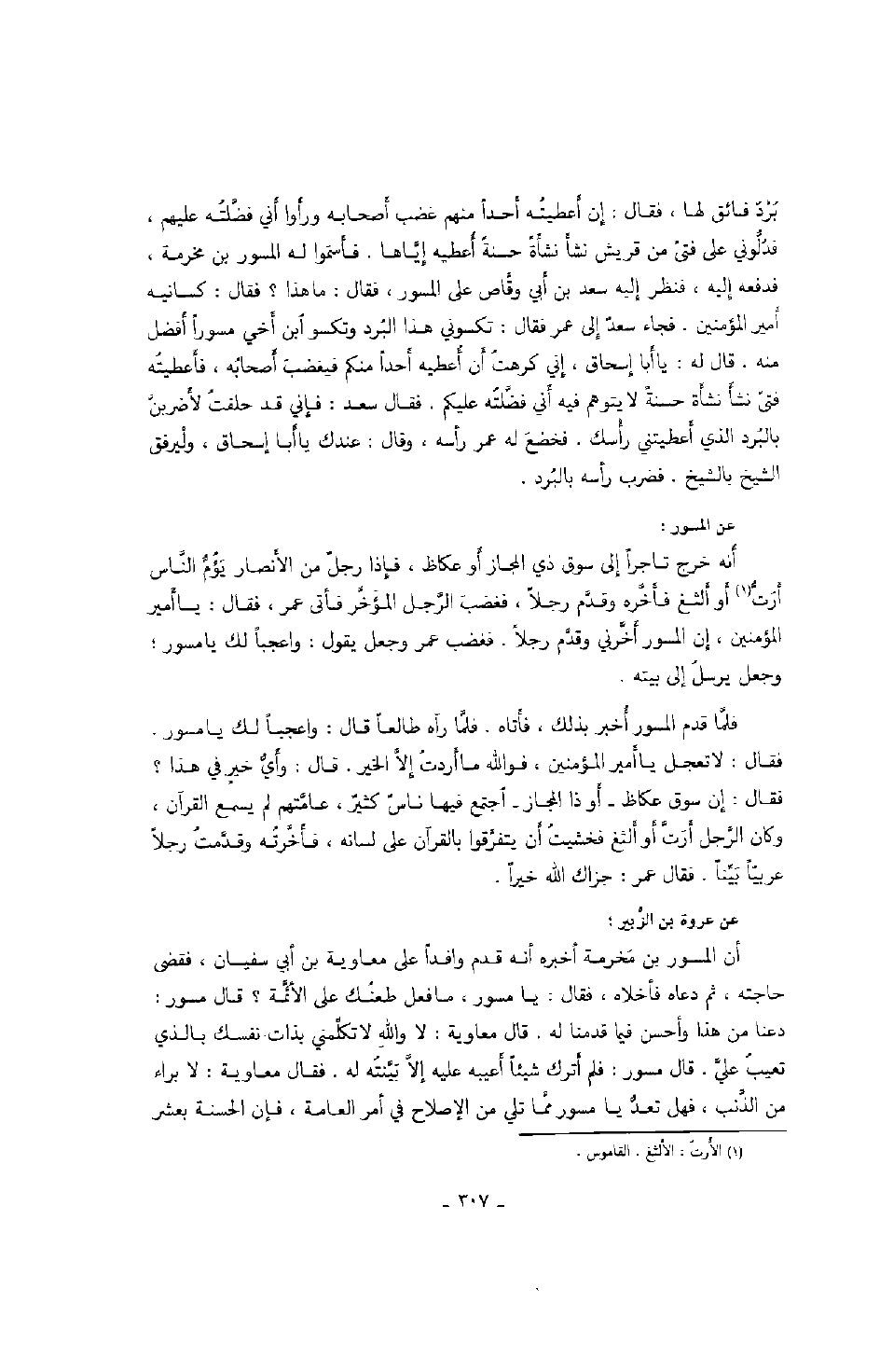 عن المسور: أنه خرج تاجراً إلى سوق ذي المجاز أو عكاظ، فإذا رجل من الأنصار يؤم الناس أرت أو ألثغ فأخره وقدم رجلاً، فغضب الرجل المؤخر فأتى عمر، فقال: يا أمير المؤمنين، إن المسور أخرني وقدم رجلاً. فغضب عمر وجعل يقول: واعجباً لك يا مسور؛ وجعل يرسل إلى بيته.