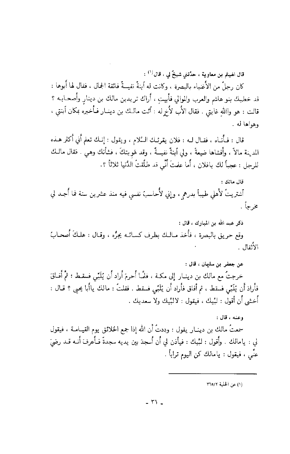 قال فأتاه، فقال له: فلان يقرئك السلام، ويقول: إنك تعلم أني أكثر هذه المدينة مالاً، وأفشاها ضيعاً، ولي ابنة نفيسة، وقد هويتك، فشأنك وهي. فقال مالك للرجل: عجباً لك يا فلان، أما علمت أني طلقت الدنيا ثلاثاً؟.
