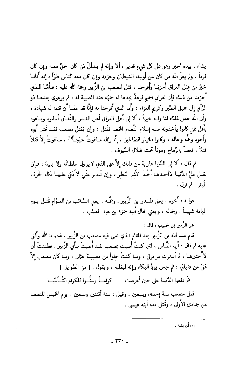 عن الزبير بن خبيب، قال: قام عبد الله بن الزبير بعد المقام الذي نعى فيه بمصعب لقد صبت بأبي الزبير. فظننت أن لا أجتبرها، ثم استمرت مريرتي، وما كنت خلواً من مصيبة عثمان، وما كان مصعب إلا فتى من فتياني؛ ثم جعل يرد البكاء وإنه ليغلبه، ويقول: " من الطويل "