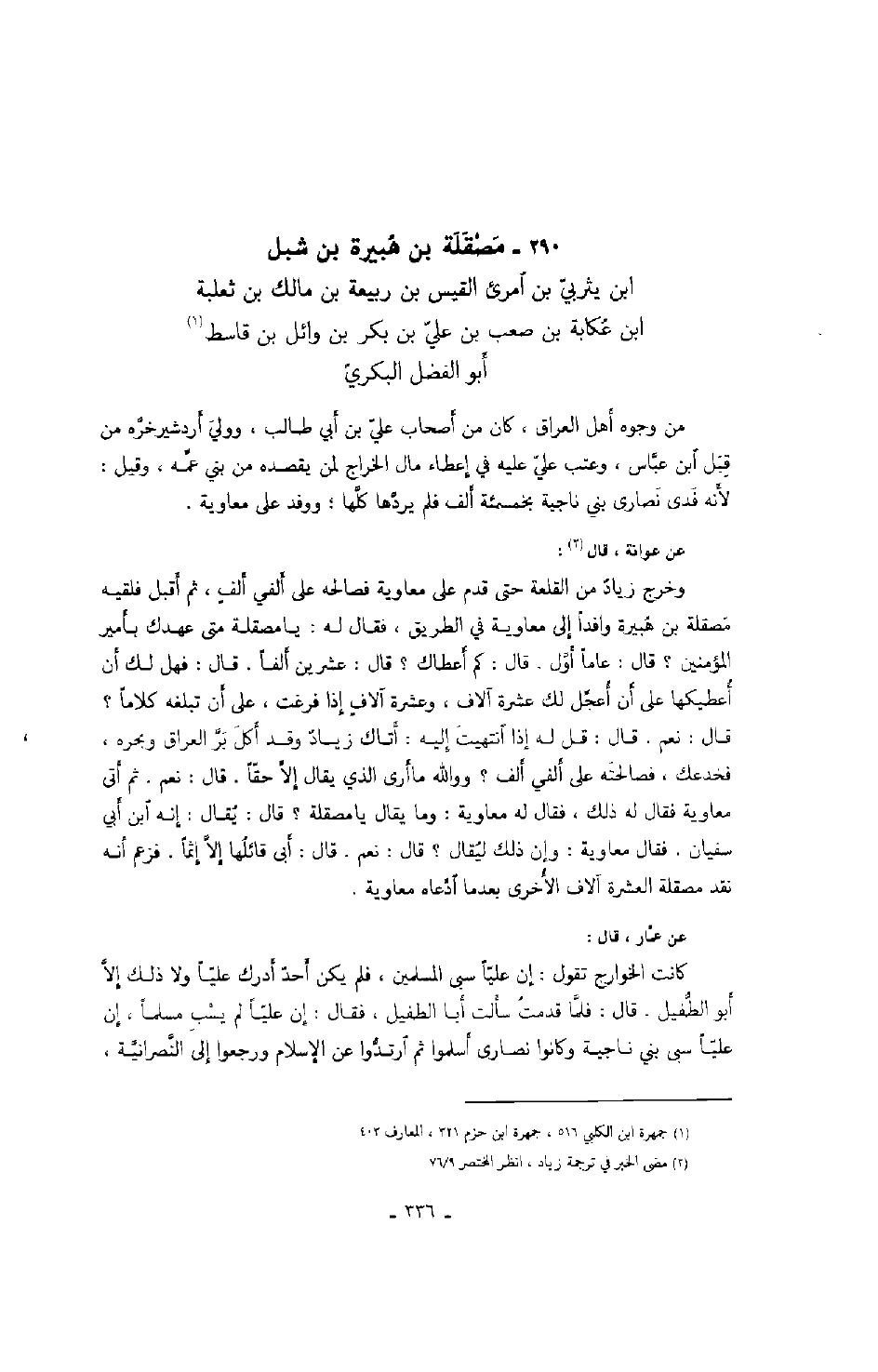 عن عوانة، قال: وخرج زياد من القلعة حتى قدم على معاوية فصالحه على ألفي ألف، ثم أقبل فلقيه مصقلة بن هبيرة وافداً إلى معاوية في الطريق، فقال له: يا مصقلة متى عهدك بأمير المؤمنين؟ قال: عاماً أول. قال: كم أعطاك؟ قال: عشرين ألفاً. قال: فهل لك أن أعطيكها على أن أعجل لك عشرة آلاف، وعشرة آلاف إذا فرغت، على أن تبلغه كلاماً؟ قال: نعم. قال: قل له إذا انتهيت إليه: أتاك زياد وقد أكل بر العراق وبحره، فخدعك، فصالحته على ألفي ألف؟ والله ما أرى الذي يقال إلا حقاً. قال: نعم. ثم أتى معاوية فقال له ذلك، فقال له معاوية: وما يقال يا مصقلة؟ قال: يقال: إنه ابن أبي سفيان. فقال معاوية: وإن ذلك ليقال؟ قال: نعم. قال: أبي قائلها إلا إثماً. فزعم أنه نقد مصقلة العشرة آلاف الأخرى بعدما ادعاه معاوية.
