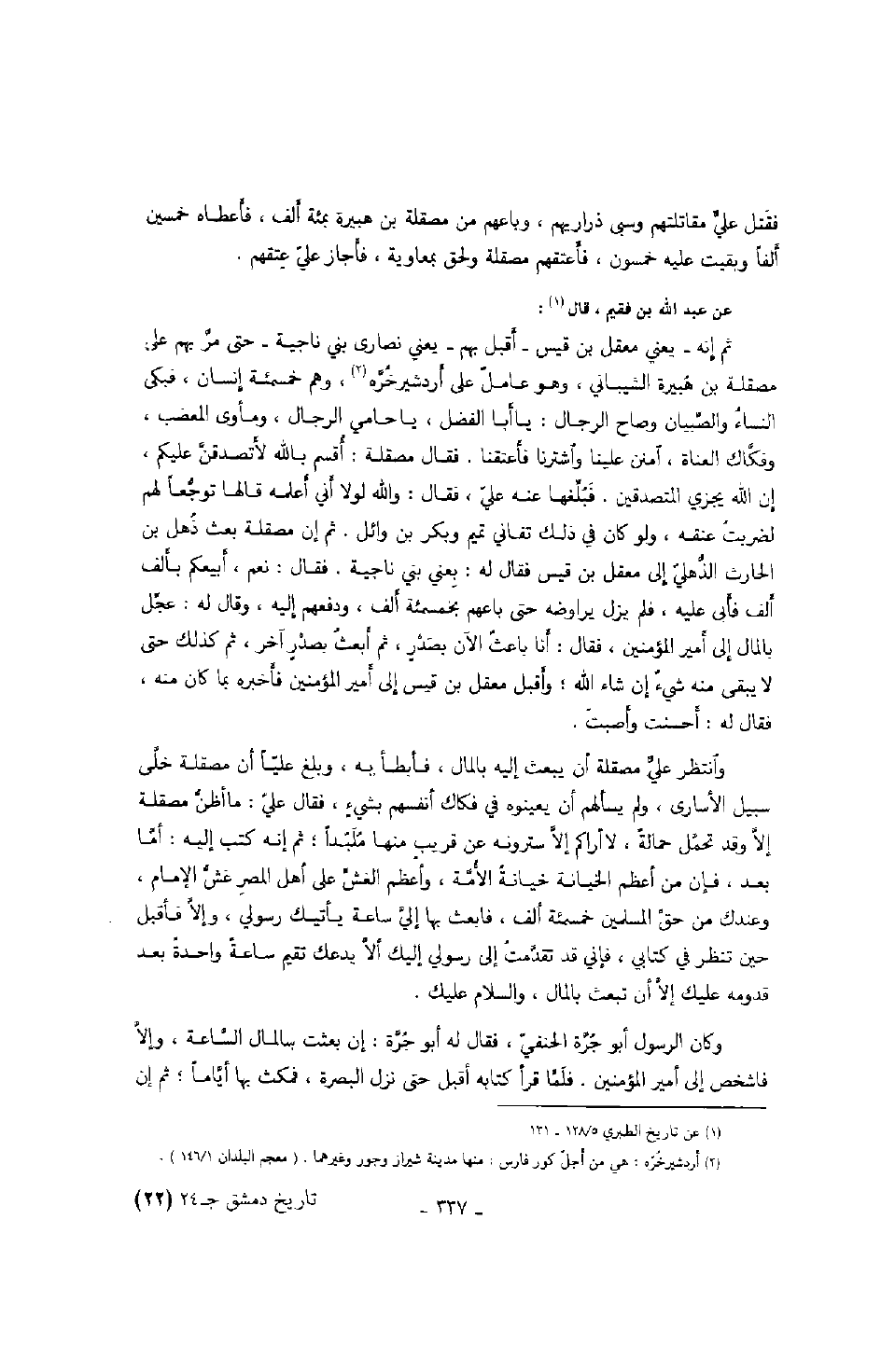 ثم إنه - يعني معقل بن قيس - أقبل بهم - يعني نصارى بني ناجية - حتى مر بهم على مصقلة بن هبيرة الشيباني، وهو عامل أردشيرخره، وهم خمسمئة إنسان، فبكى النساء والصبيان وصاح الرجال: يا أبا الفضل، يا حامي الرجال، ومأوى المعضب، وفكاك العناة، امنن علينا واشترنا فأعتقنا. فقال مصقلة: أقسم بالله لاأتصدقن عليكم، إن الله يجزي المتصدقين. فبلغها عنه علي، فقال: والله لولا أني أعلمه قالها توجعاً لهم لضربت عنقه، ولو كان في ذلك تفاني تميم وبكر بن وائل. ثم إن مصقلة بعث ذهل بن الحارث الذهلي إلى معقل بن قيس فقال له: بعني بني ناجية. فقال: نعم، أبيعكم بألف ألف فأبى عليه، فلم يزل يراوضه حتى باعهم بخمسمئة ألف، ودفعهم إليه، وقال له: عجل بالمال فأبى عليه، فلم يزل يراوضه حتى باعهم بخمسمئة ألف، ودفعهم إليه، وقال له: عجل بالمال إلى أمير المؤمنين، فقال: أنا باعث الآن بصدر، ثم أعث بصدر آخر، ثم كذلك حتىلا بقى منه شيء إن شاء الله؛ وأقبل معقل بن قيس إلى أمير المؤمنين فأخبره بما كان منه، فقال له: أحسنت وأصبت.