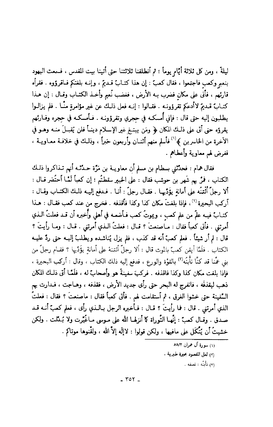 ليلة، ومن كل ثلاثة أيام يوماً؛ ثم انطلقنا ثلاثتنا حتى أتينا بيت المقدس، فسمعت اليهود بنعيم وكعب فاجتمعوا، فقال كعب: إن هذا الكتاب قديم، وإنه بلغتكم فاقرؤوه. فقرأه قارئهم، فأتى على مكان فضرب به الأرض، فغضب نعيم واخذ الكتاب وقال: إن هذا كتاب قديم لا أدعكم تقرؤونه. فقالوا: إنه فعل ذلك عن غير مؤامرة منا. فلم يزالوا يطلبون إليه حتى قال: فإني أمسكه في حجري وتقرؤونه. فأمسكه في حجره وقارئهم يقرؤه حتى أتى على ذلك المكان " ومن يبتغ غير الإسلام ديناً فلن يقبل منه وهو في الآخرة من الخاسرين " فأسلم منهم اثنان وأربعون حبراً، وذلك في خلافة معاوية، ففرض لهم معاوية وأعطاهم.