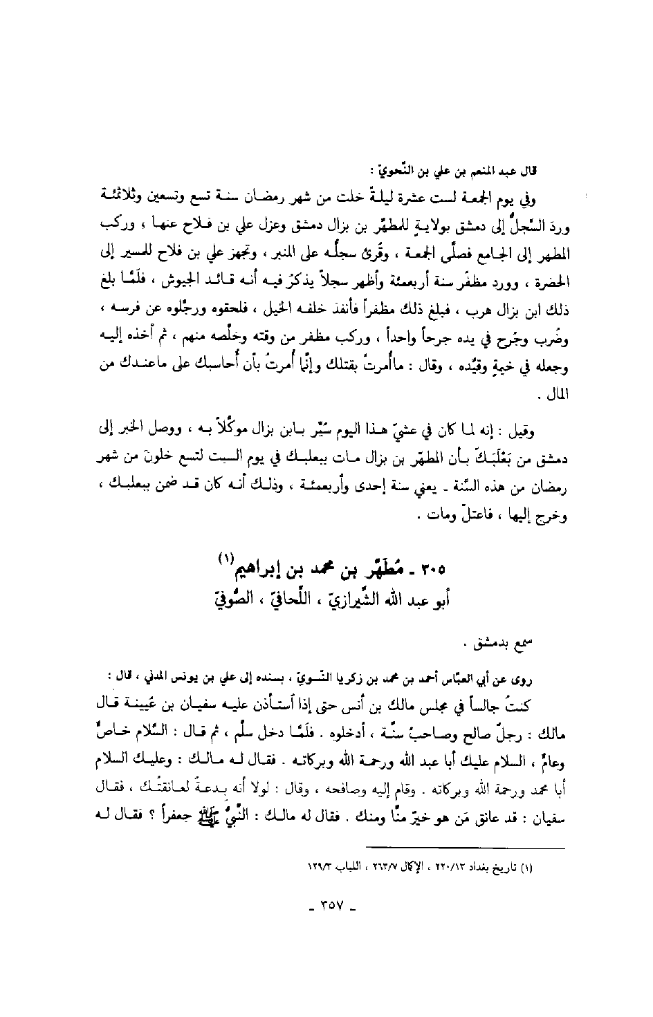 وفي يوم الجمعة لست عشرة ليلة خلت من شهر رمضان سنة تسعين وثلاثمئة ورد السجل إلى دمشق بولاية للمطهر بن بزال دمشق وعزل غلي بن فلاح عنها، وركب المطهر إلى الجامع فصلى الجمعة، وقرئ سجله على المنبر، وتجهز علي بن فلاح للمسير إلى الحضرة، وورد مظفر سنة أربعمئة وأظهر سجلاً يذكر فيه أنه قائد الجيوش، فلما بلغ ذلك ابن بزال هرب، فبلغ ذلك مظفراً فأنفذ خلفه الخيل، فلحقوه ورجلوه عن فرسه، وضرب وجرح في يده جرحاً واحداً، وركب مظغر من وقته وخلصه منهم، ثم أخذه إليه وجعله في خيمة وقيده، وقال: ما أمرت بقتلك وإنما أمرت بأن أحاسبك على ما عندك من المال.