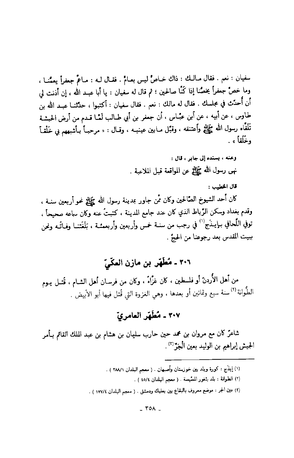 سفيان: نعم. فقال مالك: ذاك خاص ليس بعام. فقال له: ما عم جعفراً يعمنا، وما خص جعفراً يخصنا إذا كنا صالحين؛ ثم قال له سفيان: يا أبا عبد الله، إن أذنت لي أن أحدث في مجلسك. فقال له مالك: نعم. فقال سفيان: اكتبوا، حدثنا عبد الله بن طاوس، عن أبيه، عن ابن عباس، أن جعفر بن أبي طالب لما قدم من أرض الحبشة تلقاه رسول الله صَلَّى اللهُ عَلَيْهِ وَسَلَّمَ واعتنقه، وقبل ما بين عينيه، وقال: " مرحباً بأشبههم بي خلقاً وخلقاً ".
