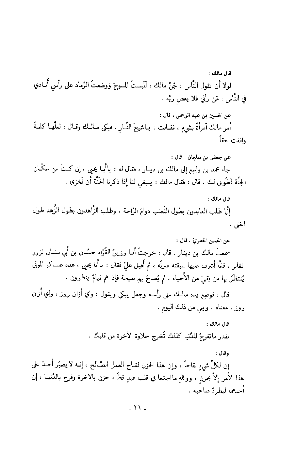قال مالك: لولا أن يقول الناس: جن مالك، للبست المسوح ووضعت الرماد على رأسي أنادي في الناس: من رآني فلا يعص ربه.