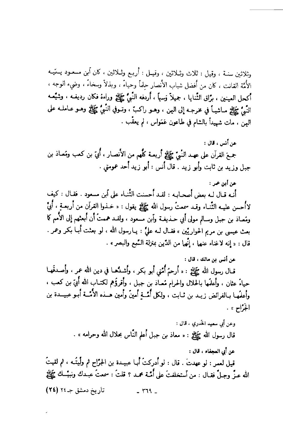 عن أنس بن مالك، قال: قال رسول الله صَلَّى اللهُ عَلَيْهِ وَسَلَّمَ: " أرحم أمتي أبو بكر، وأشدها في دين الله عمر، وأصدقها حياء عثمان، وأعلمها بالحلال والحرام معاذ بن جبل، وأقرؤهم لكتاب الله أبي بن كعب، وأعلمها بالفرائض زيد بن ثابت، ولكل أمة أمين وأمين هذه الأمة أبو عبيدة بن الجراح ".