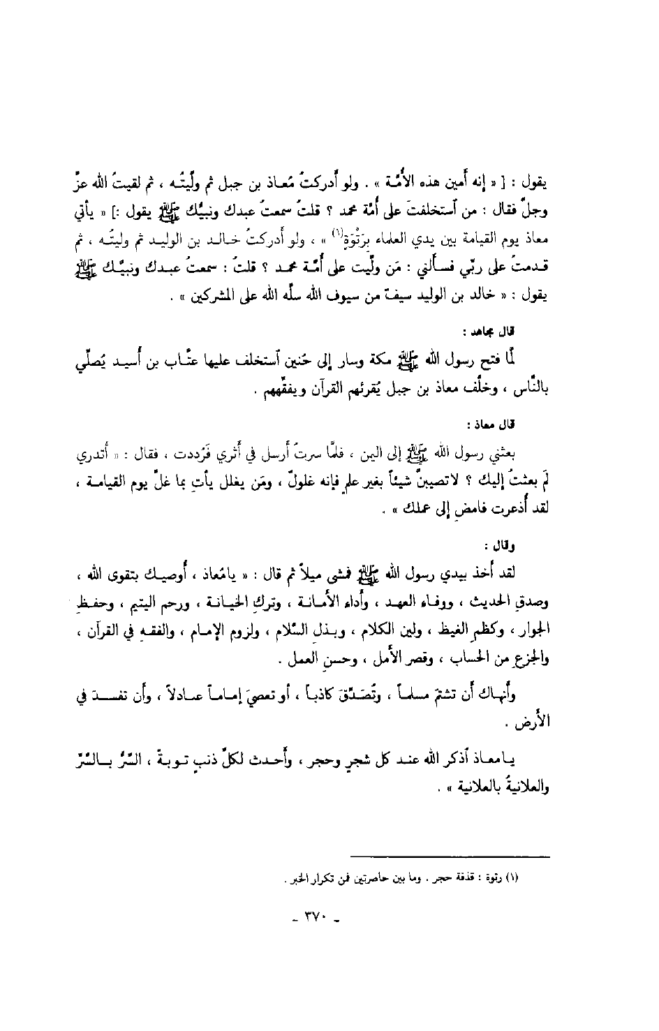 وقال: لقد أخذ بيدي رسول الله صَلَّى اللهُ عَلَيْهِ وَسَلَّمَ فمشى ميلاً ثم قال: " يا معاذ، أوصيك بتقوى الله، وصدق الحديث، ووفاء العهد، وأداء الأمانة، وترك الخيانة، ورحم اليتيم، وحفظ الجوار، وكظم الغيظ، ولين الكلام، وبذل السلام، ولزوم الإمام، والفقه في القرآن، والجزع من الحساب، وقصر الأمل، وحسن العمل.