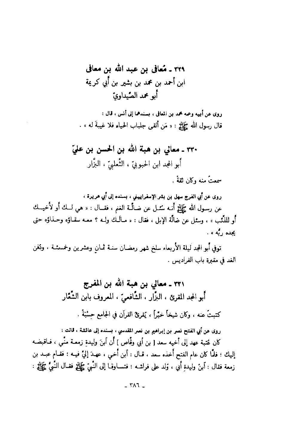 ابن أحمد بن محمد بن بشير بن أبي كريمة أبو محمد الصيداوي روى عن أبيه وعمه محمد بن المعافى، بسنده إلى أنس، قال: قال رسول الله صَلَّى اللهُ عَلَيْهِ وَسَلَّمَ: " من ألقى جلباب الحياء فلا غيبة له ".