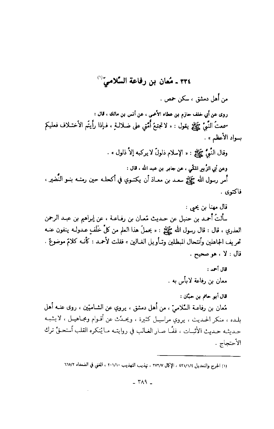 قال أحمد: معان بن رفاعة لا بأس به، قال أبو حاتم بن حبان: معان بن رفاعة السلامي، من أهل دمشق، يروي عن الشاميين، روى عنه أهل بلده، منكر الحديث، يروي مراسيل كثيرة، ويحدث عن أقوام ومجاهيل، لا يشبه حديثه حديث الأثبات، فلما صار الغالب في روايته ما ينكره القلب استحق ترك الاحتجاج.