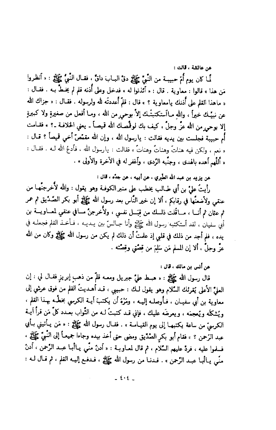 عن عائشة، قالت: لما كان يوم أم حبيبة من النبي صَلَّى اللهُ عَلَيْهِ وَسَلَّمَ دق الباب داق، فقال النبي صَلَّى اللهُ عَلَيْهِ وَسَلَّمَ: " انظروا من هذا " قالوا: معاوية. قال: " ائذنوا له " فدخل وعلى أذنه قلم لم يخط به، فقال: " ما هذا القلم على أذنك يا معاوية؟ " قال: قلم أعددته لله ولرسوله. فقال: " جزاك الله عن نبيك خيراً، والله ما استكتبتك إلا بوحي من الله، وما أفعل من صغيرة ولا كبيرة إلا بوحي من الله عز وجل، كيف بك لو قمصك الله قميصاً - يعني الخلافة -؟ " فقامت أم حبيبة فجلست بين يديه فقالت: يا رسول الله، وإن الله مقمص أخي قميصاً؟ قال: " نعم، ولكن فيه هنات وهنات وهنات " فقالت: يا رسول الله، فأدع الله له. فقال: " اللهم اهده بالهدى، وجنبه الردى، واغفر له في الآخرة والأولى ".