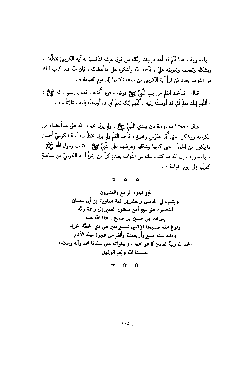 قال: فجثا معاوية بين يدي النبي صَلَّى اللهُ عَلَيْهِ وَسَلَّمَ، ولم يزل يحمد الله على ما أعطاه من الكرامة ويشكره حتى أتي بطرس ومحبرة، فأخذ القلم ولم يزل يخط به آية الكرسي أحسن ما يكون من الخط، حتى كتبها وشكلها وعرضها على النبي صَلَّى اللهُ عَلَيْهِ وَسَلَّمَ، فقال رسول الله صَلَّى اللهُ عَلَيْهِ وَسَلَّمَ: " يا معاوية، إن الله قد كتب لك من الثواب بعدد كل من يقرأ آية الكرسي من ساعة كتبتها إلى يوم القيامة ".