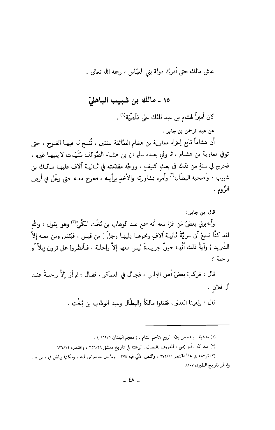 قال: ولقينا العدو، فقتلوا مالكاً والبطال وعبد الوهاب بن بخت.