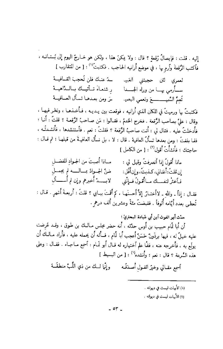 حدث أبو الغوث ابن عبادة البحتري: أن أبا تمام حبيب بن أوس حدثه، أنه حضر مجلس مالك بن طوق، وقد عرضت عليه خيل له، فيها برذون حسن أعجب أبا تمام، فسأله أن يحمله عليه، فأراد مالك أن يولع به، فأخرجه عنه، فلما علم اختياره له قال أبو تمام، فسأله أن يحمله عليه، فأراد مالك أن يولع به، فأخرجه عنه، فلما علم اختياره له قال أبو تمام: اسمع ما جاء. فقال: وعلى هذه السرعة؟ قال: نعم؛ وأنشده: " من البسيط "