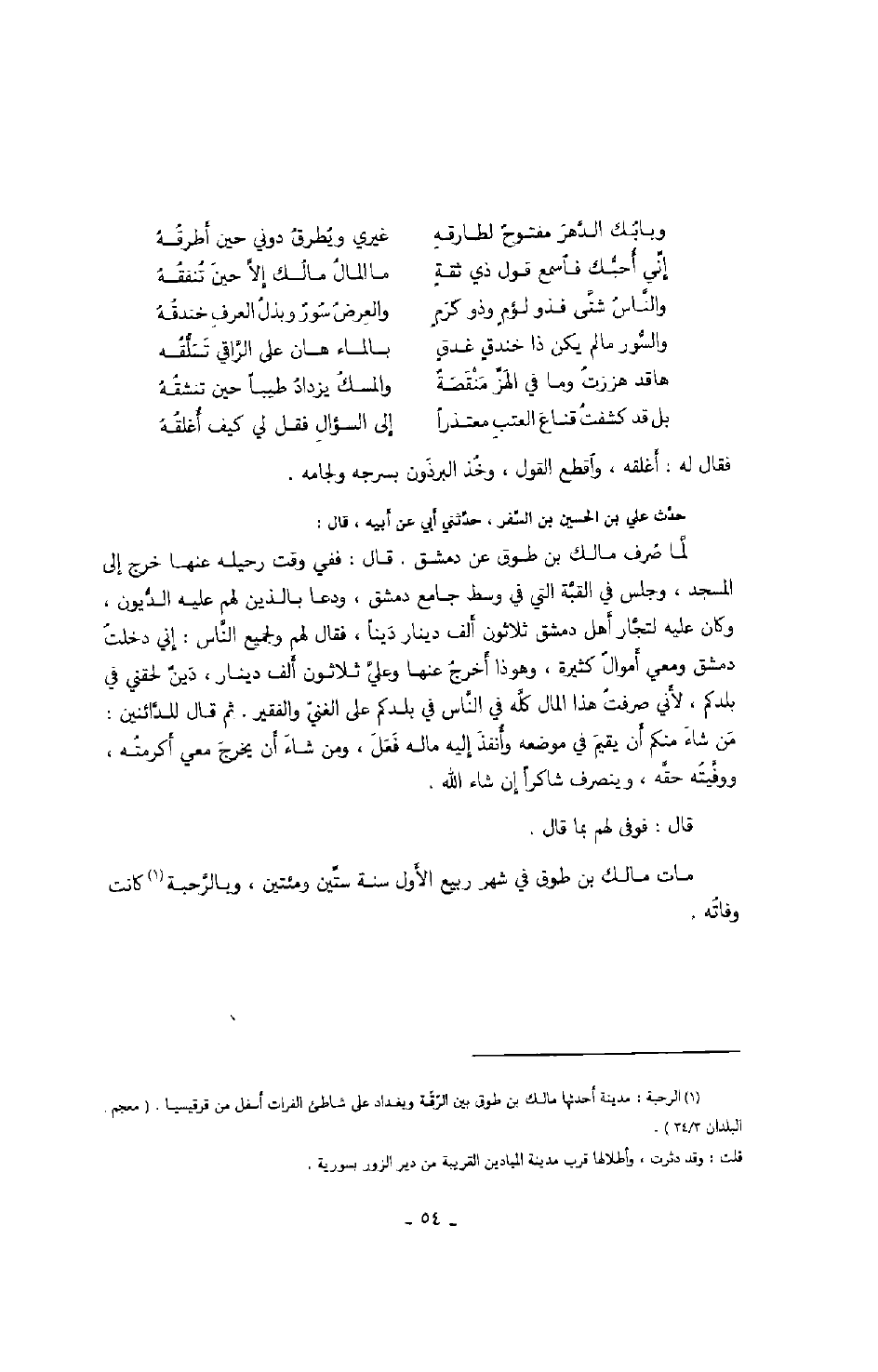 لما صرف مالك بن طوق عن دمشق. قال: ففي وقت رحيله عنها خرج إلى المسجد، وجلس في القبة التي في وسط جامع دمشق، ودعا بالذين لهم عليه الديون، وكان عليه لتجار أهل دمشق ثلاثون ألف دينار، فقال لهم ولجميع الناس: إني دخلت دمشق ومعي أموال كثيرة، وهو ذا أخرج عنها وعلي ثلاثون ألف دينار، دين لحقني في بلدكم، لأني صرفت هذا المال كله في الناس في بلدكم على الغني والفقير. ثم قال للدائنين: من شاء منكم أن يقيم في موضعه وأنفذ إليه ماله فعل، ومن شاء أن يخرج معي أكرمته، ووفيته حقه، وينصرف شاكراً إن شاء الله.