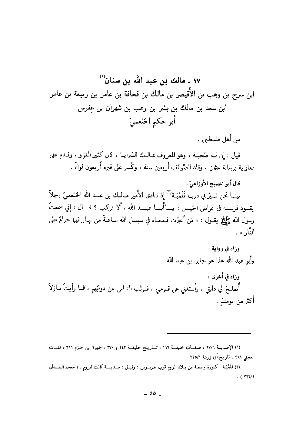 قال أبو المصبح الأوزاعي: بينا نحن نسير في درب قلمية إذ نادى الأمير مالك بن عبد الله الخثعمي رجلاً يقود فرسه في عراض الخيل: يا أبا عبد الله، ألا تركب؟ قال: إني سمعت رسول الله صَلَّى اللهُ عَلَيْهِ وَسَلَّمَ يقول: " من اغبرت قدماه في سبيل الله ساعة من نهار فهما حرام على النار ".