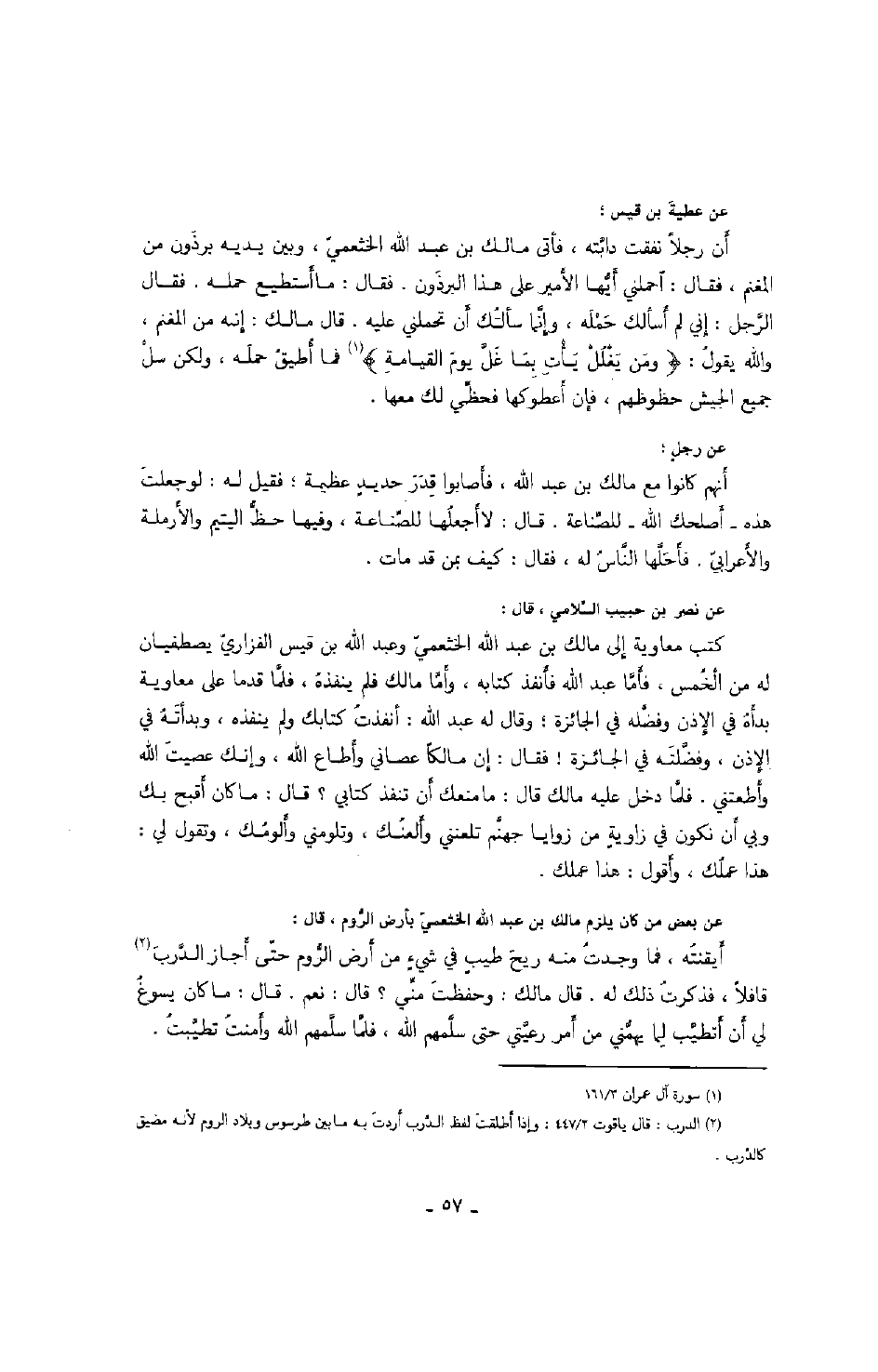 عن عطية بن قيس: أن رجلاً نفقت دابته، فأتى مالك بن عبد الله الخثعمي، وبين يديه برذون من المغنم، فقال: احملني أيها الأمير على هذا البرذون. فقال: ما أستطيع حمله. فقال الرجل: إني لم أسألك حمله، وإنما سألتك أن تحملني عليه. قال مالك: إنه من المغنم، والله يقول: " ومن يغلل يأت بما غل يوم القيامة " فما أطيق حمله، ولكن سل جميع الجيش حظوظهم، فإن أعطوكها فحظي لك معها.