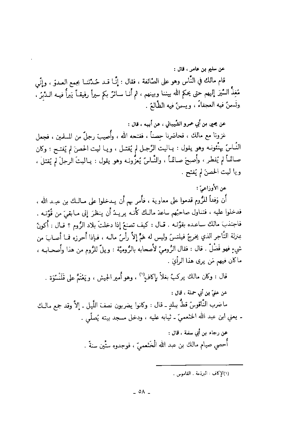 عن سليم بن عامر، قال: قام مالك في الناس وهو على الصائفة، فقال: إن قد حدثنا بجمع العدو، وإني مغذ السير اإليهم حتى يحكم الله بيننا وبينهم، ثم أنا سائر بكم سيراً رفيقاً يبرأ فيه الدبر، وتسمن فيه العجفاء، ويسمن فيه الظالع.