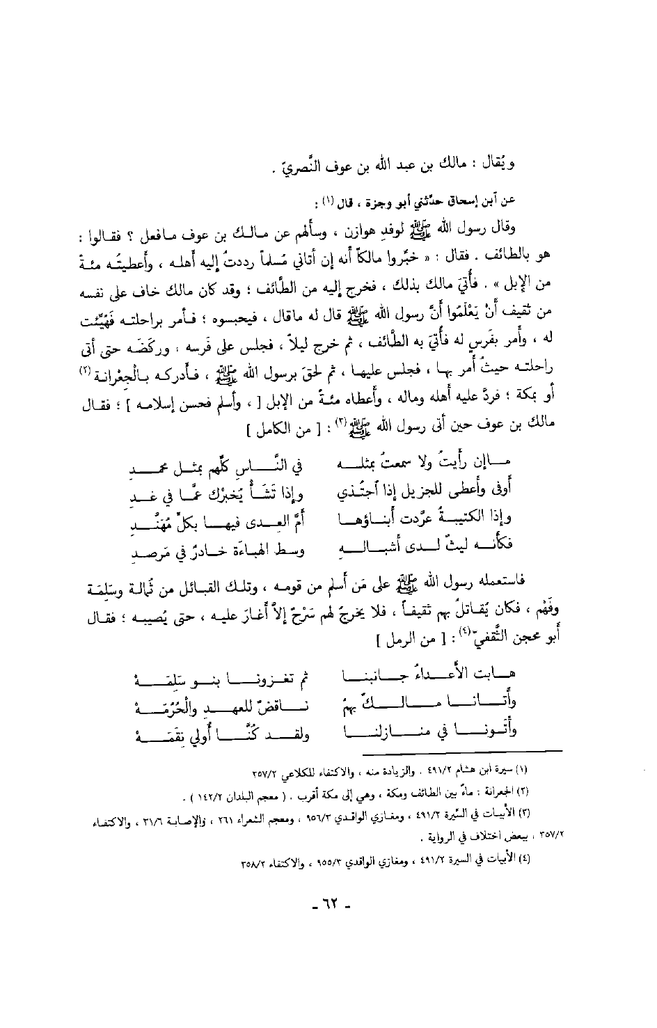 عن ابن إسحاق حدثني أبو وجزة، قال: وقال رسول الله صَلَّى اللهُ عَلَيْهِ وَسَلَّمَ لوفد هوزان، وسألهم عن مالك بن عوف ما فعل؟ فقالوا: هو بالطائف. فقال: " خبروا مالكاً أنه إن أتاني مسلماً رددت إليه أهله، وأعطيته مئة من الإبل ". فأتى مالك بذلك، فخرج إليه من الطائف؛ وقد كان مالك خاف على نفسه من ثقيف أن يعلموا أن رسول الله صَلَّى اللهُ عَلَيْهِ وَسَلَّمَ قال ما قال، فيحبسوه؛ فأمر براحلته فهيئت له، وأمر بفرس له فأتى به الطائف، ثم خرج ليلاً، فجلس على فرسه، وركضه حتى أتى راحلته حيث أمر بها، فجلس عليها، ثم لحق برسول الله صَلَّى اللهُ عَلَيْهِ وَسَلَّمَ، فأدركه بالجعرانة أو بمكة؛ فرد عليه أهله وماله، وأعطاه مئة من الإبل، وأسلم فحسن إسلامه؛ فقال مالك بن عوف حين أتى رسول الله صَلَّى اللهُ عَلَيْهِ وَسَلَّمَ: من الكامل "