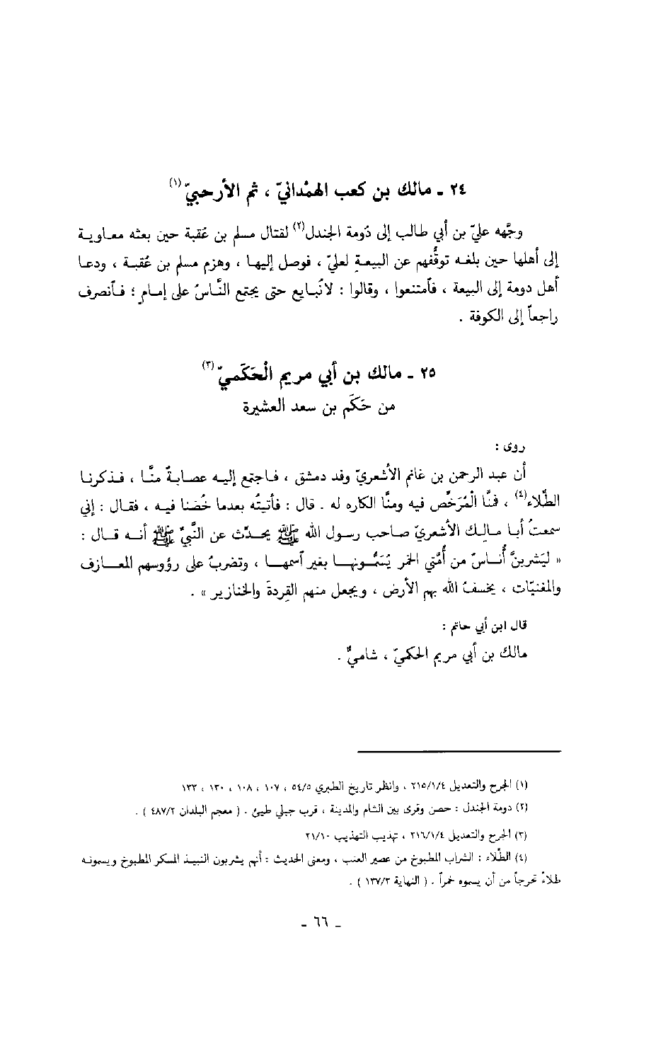 من حكم بن سعد العشيرة روى: أن عبد الرحمن بن غانم الأشعري وفد دمشق، فاجتمع إليه عصابة منا، فذكرنا الطلاء، فمنا المرخص فيه ومنا الكاره له. قال: فأتيته بعدما خضنا فيه، فقال: إني سمعت أبا مالك الأشعري صاحب رسول الله صَلَّى اللهُ عَلَيْهِ وَسَلَّمَ يحدث عن النبي صَلَّى اللهُ عَلَيْهِ وَسَلَّمَ أنه قال: " ليشربن أناس من أمتي الخمر يسمونها بغير اسمها، وتضرب على رؤوسهم المعازف والمغنيات، يخسف الله بهم الأرض، ويجعل منهم القردة والخنازير ".