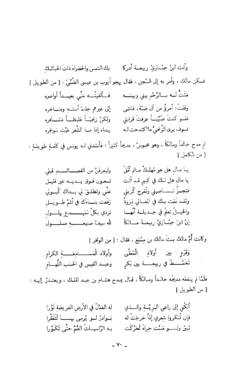 ثم مدح خالداً ومالكاً، وهو محبوس، مديحاً كثيراً؛ فأنشدني له يونس في كلمة طويلة: " من الكامل "
