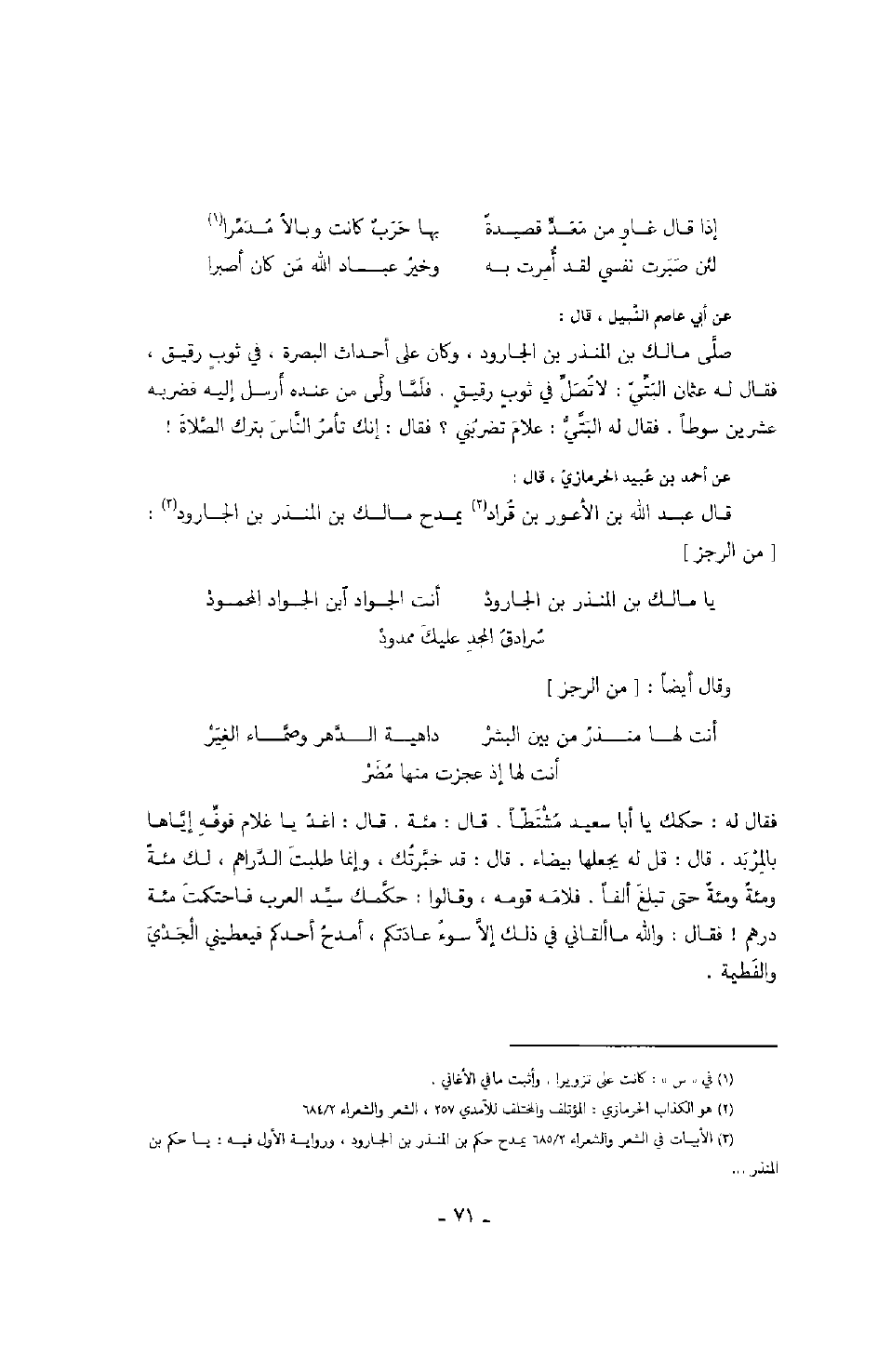 عن أبي عاصم النبيل، قال: صلى مالك بن المنذر بن الجارود، وكان على أحداث البصرة، في ثوب رقيق، فقال له عثمان البتي: لا تصل في ثوب رقيق. فلما ولى من عنده أرسل إليه فضربه عشرين سوطاً. فقال له البتي: علام تضربني؟ فقال: إنك تأمر الناس بترك الصلاة! عن أحمد بن عبيد الحرمازي، قال: قال عبد الله بن الأعور بن قراد يمدح مالك بن المنذر بن الجارود: " من الرجز