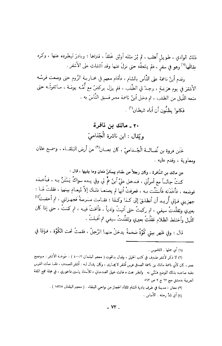 عن مالك بن النافرة، وكان رجلاً من جذام يسكن معان وما يليها، قال: كنت جالساً مع امرأتي، فدخل علي ابن عم لي وفي يده سواك يستن به، فأخذه فوضعه، فأخذته فاستنت به، فعرفت أنهما لم يصنعا ذلك إلا لميعاد بينهما، فقلت لها: جهزيني فإني أريد أن أنطلق إلى كذا وكذا؛ فقامت مسرعة فجهزتني، ثم أحقبت بعيري وتقلدت سيفي، ثم ركبت حتى أتيت وادياً، فأنخت فيه، ثم كمنت، حتى إذا كان الليل واختلط الظلام عقلت بعيري وتقلدت سيفي ثم أقبلت.